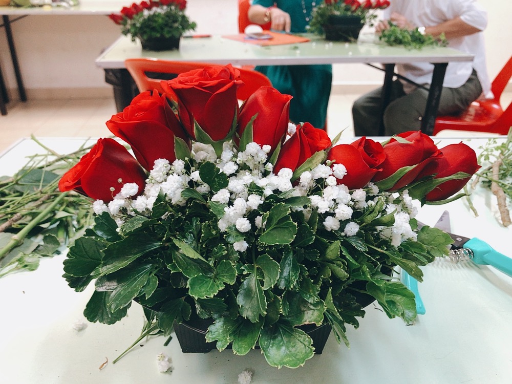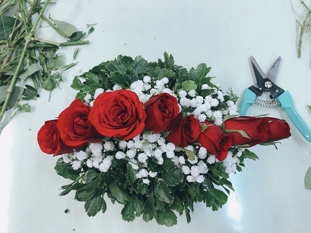 장미로 먼저 틀을 잡고 Tea leaf로 그린을 주고 마지막에 안개꽃으로 장미를 더 포인트 해 주면 된다.