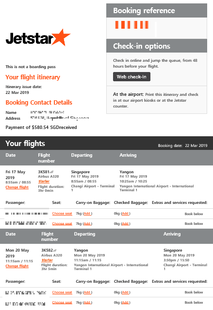 싱가폴에서 양곤까지는 3시간 정도가 걸리고 수화물 미포함 290 SGD (약 237,800원)에 구매했다.