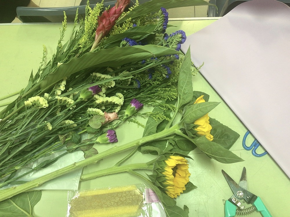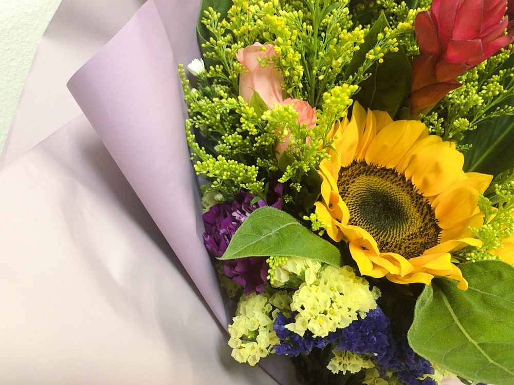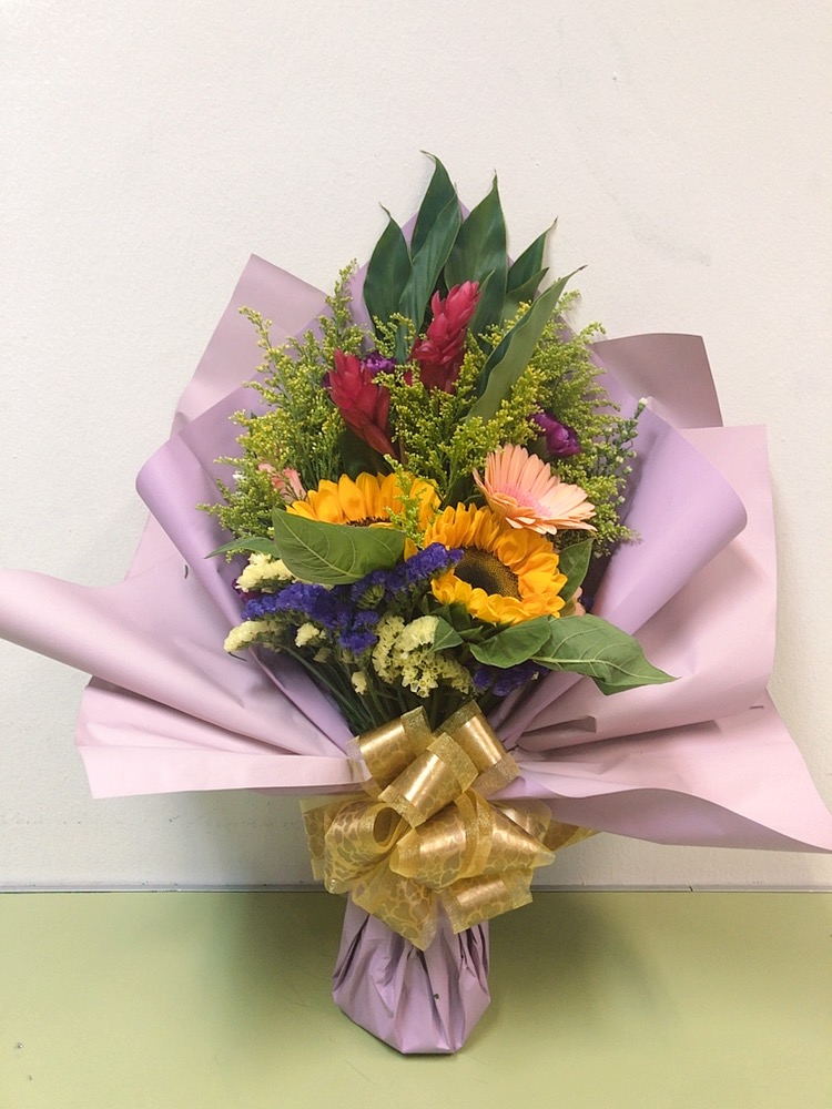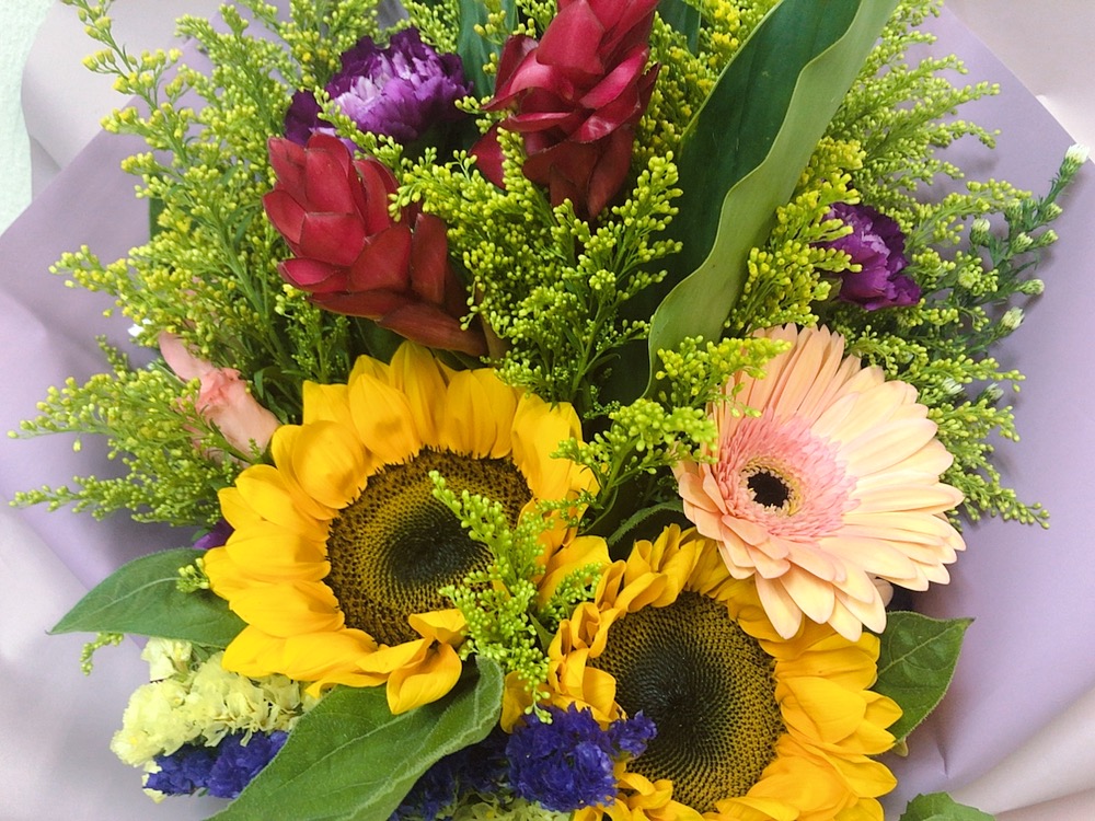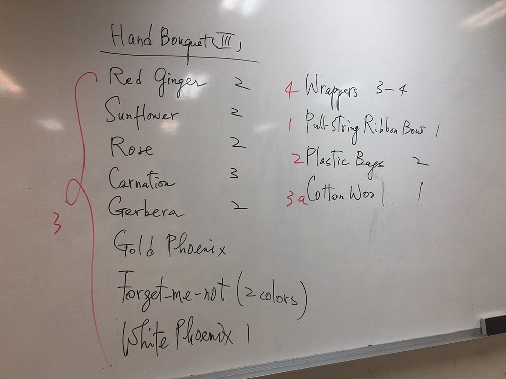 - Red ginger 2 - Sunflower 2 - Rose 2 - Carnation 2 - Gerbera 2 - Gold Phoenix - Forget-me-not (2 colors) - White Phoenix 1 - Wrappers 3-4 - Pull-string Ribbon Bows 1 - Plastic bags 2 - Cotton Wool 1 |