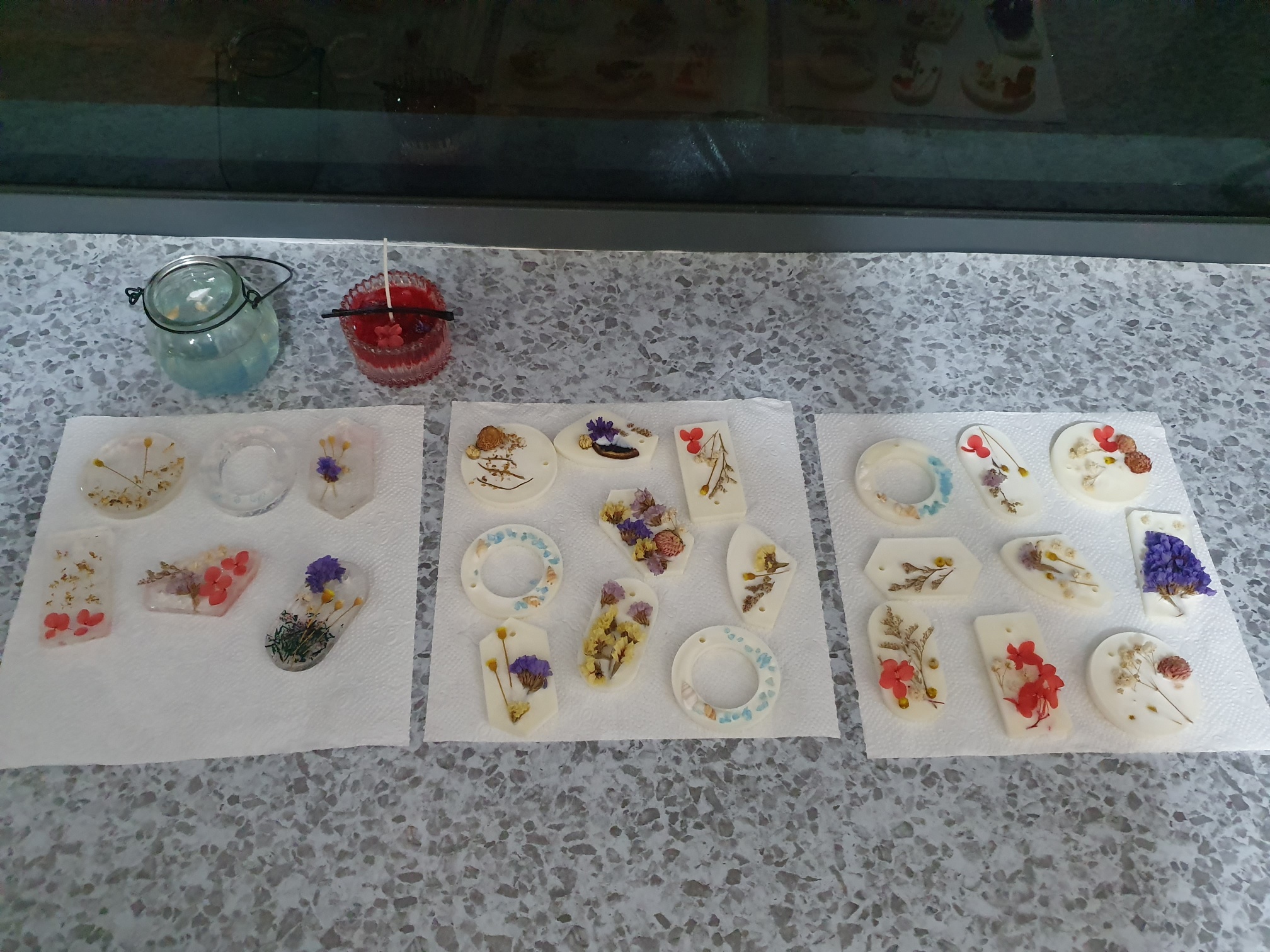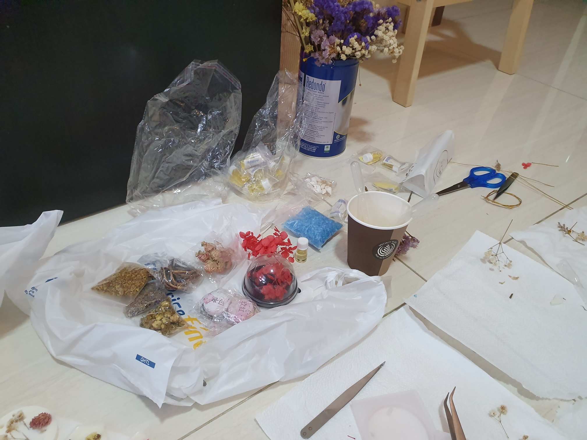 왁스도 투명/불투명으로 갖고 있고 20가지 정도의 향료와 컬러 파우더, 드라이플라워 등의 재료들도 많았다.