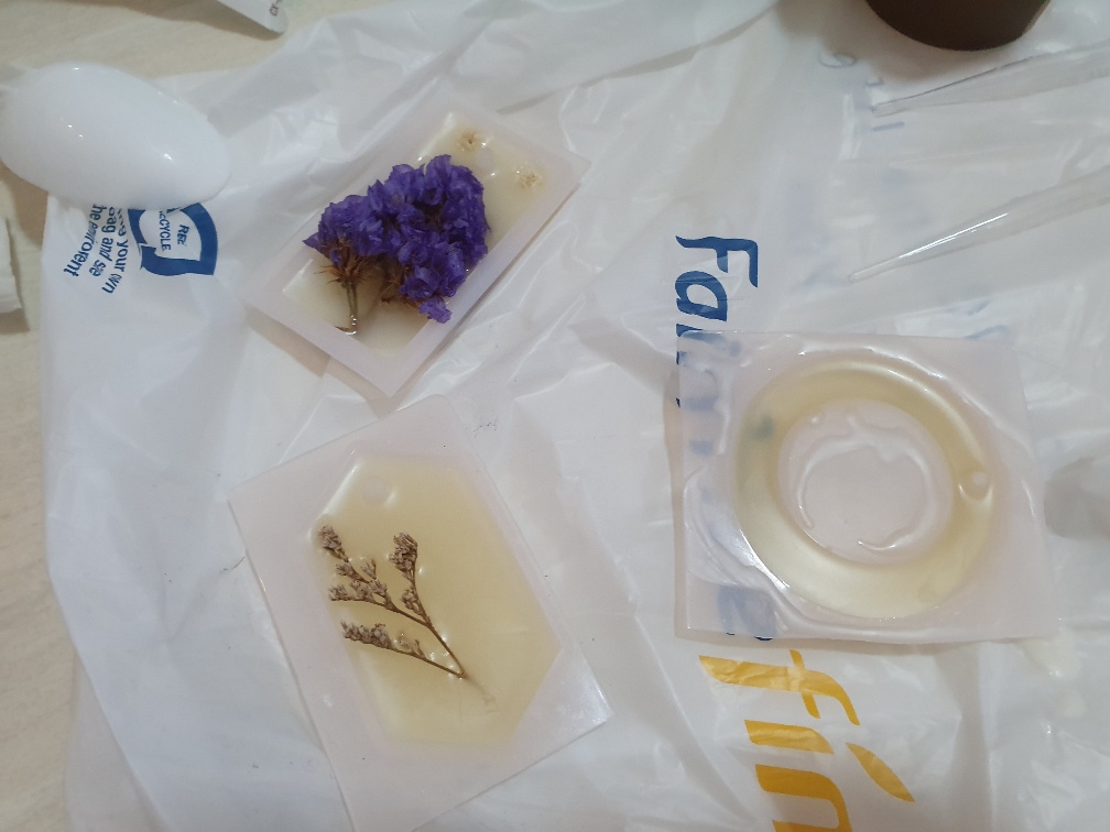 그리고 조금 있다 몰드에 부어주고(굉장히 뜨겁!!) 기다린 후 왁스 컬러가 하얀색으로 바뀔 때쯤 재료들을 얹어 굳혀지길 또 기다리면 된다. 끝!