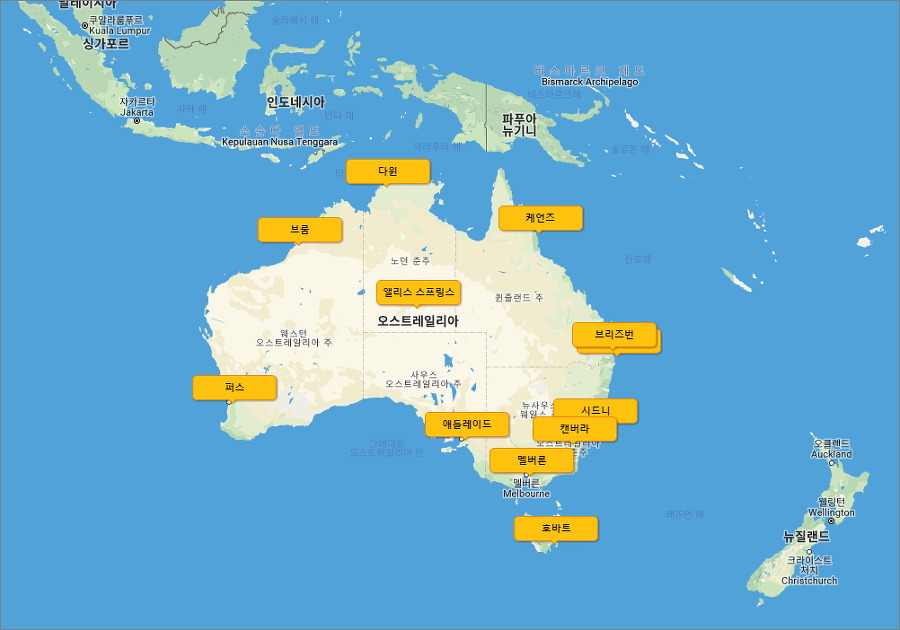 정말 듣보 지역인데(호주 잘 모름) 싱가폴과 굉장히 가깝다. 비행기로 4시간 40분 정도가 걸리는데 중요한 건 볼 게 없다 ㅠㅠ 그냥 시골 동네 좋은 공기 쐬러 가야 할 듯...