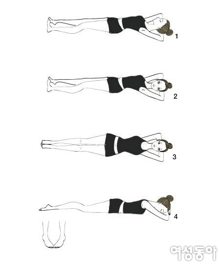 천장을 보고 바닥에 누운 뒤 다리를 M자 모양으로 접는다. 무릎은 가능한 한 모으고 발뒤꿈치를 허리 가까이에 붙인 채 자세를 1분간 유지한다.