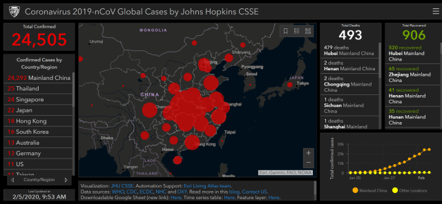 2020-02-06 : 코로나 바이러스 실시간 국제현황 - 존스홉킨스/코로나알리미/코로나맵
