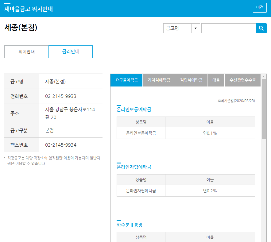 사이트 오른쪽 위에 있는 금고위치안내에서 지점별 금리를 클릭하면 된다. 간단!