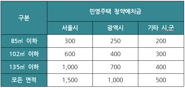 그리고 민영주택 역시 해당 지역에 거주하여야 하지만 투기과열지대가 아니면 무주택자가 아니어도 되고 수도권 기준 12개월 이상, 12회 이상 납입하면 되는데 중요한건 기준예치금이 있어야 한다. 서울시 기준 모든 면적을 지원하려면 모집공고 전까지 1,500만원이 있어야 하므로 기본적으로 1,500만원은 넣어두는게 좋다.
