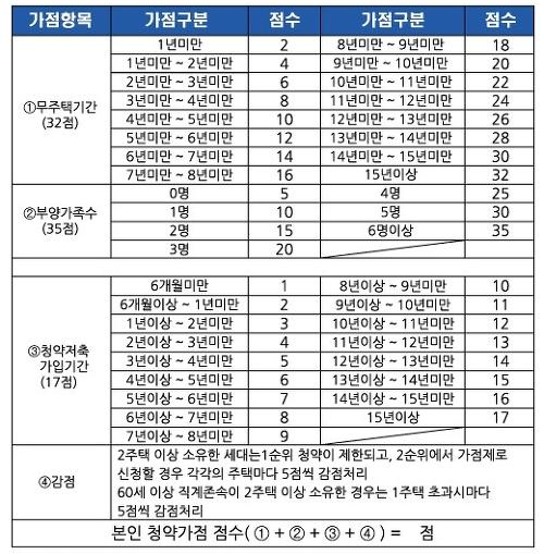 무주택기간+부양가족수+청약저축가입기간의 가점이 있다. 무주택기간 가점으로 만약 무주택자가 아닌 부모님집에서 사는 미혼 청년일 경우에는 만 30살부터 무주택 기간이 산정된다. 그리고 만 30살 이전에 결혼을 했을 경우 혼인신고일부터 무주택 기간이 산정된다. 만 30살 이전에 결혼했고 아이까지 있고 청약저축 가입을 17살부터 했다면 확률이 높다는 뜻!