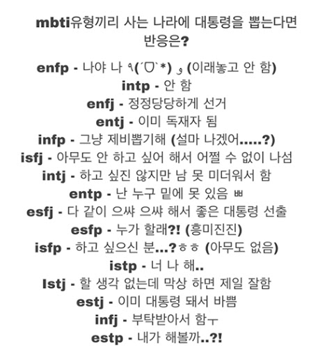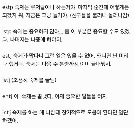 그 외에도 MBTI별로 특징을 담은 짤들을 주워와 봤습니다.