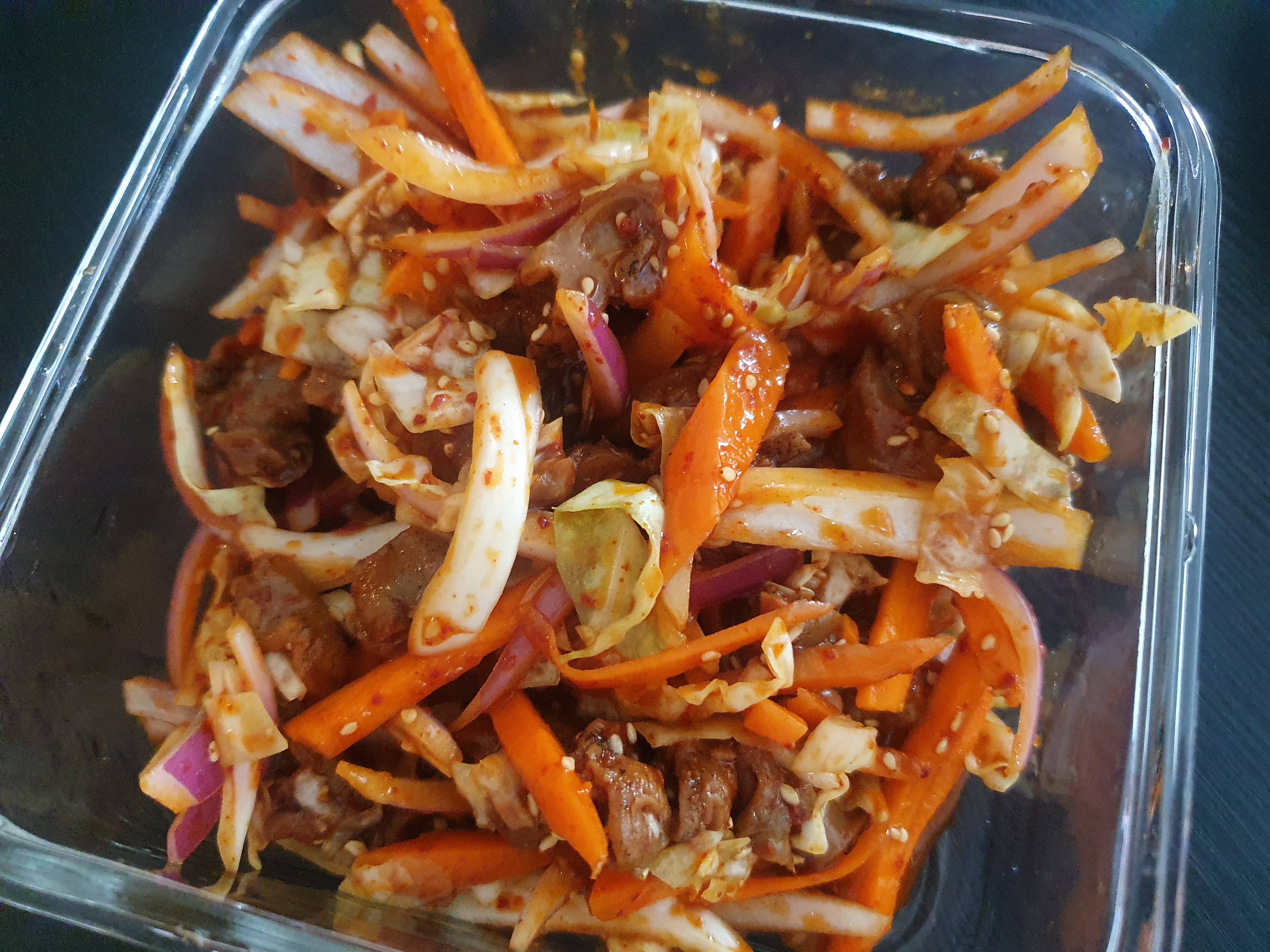 잘게 썬 양배추, 양파, 당근, 오이 등과 골뱅이를 소스와 섞어주기만 하면 된다. 소스는 고추장, 고춧가루, 설탕, 식초이고 마지막에 참기름과 깨를 솔솔 뿌리면 끝! 반찬으로도 좋고 소면 삶아 넣어서 골뱅이 소면으로 먹어도 된다.