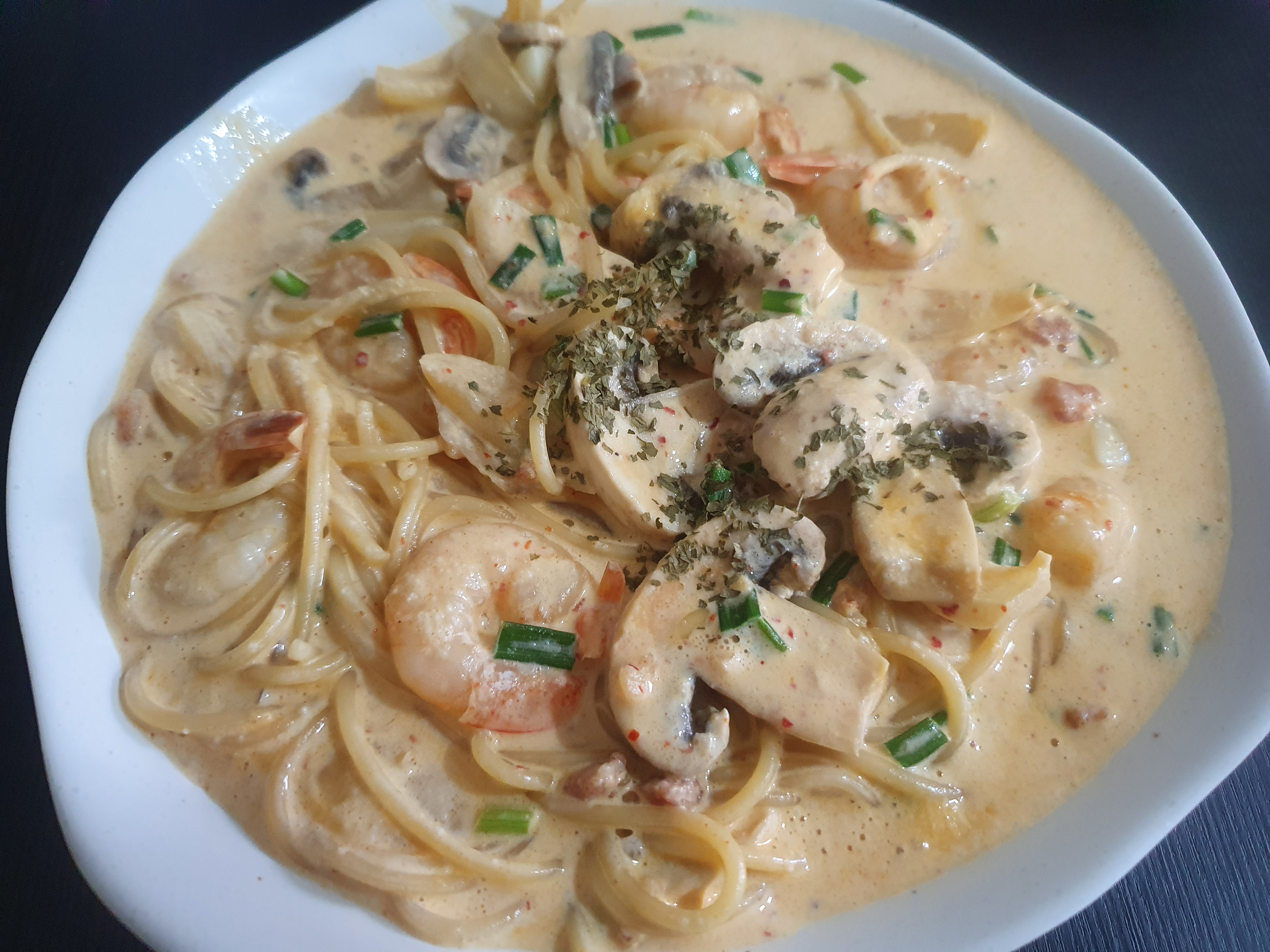 우유, 생크림 250ml에 쪽파를 썰어 넣고 간장 1스푼을 넣어 소스를 만들고 냉장고에 30분~ 보관한다. 새우는 고춧가루, 소금/후추로 밑간을 해 준다. 이제 프라이팬에 마늘, 양파, 브로콜리, 버섯 등을 볶아주다가 소스와 새우를 넣고 체다치즈 1장과 삶은 파스타 면을 넣어주면 끝!
