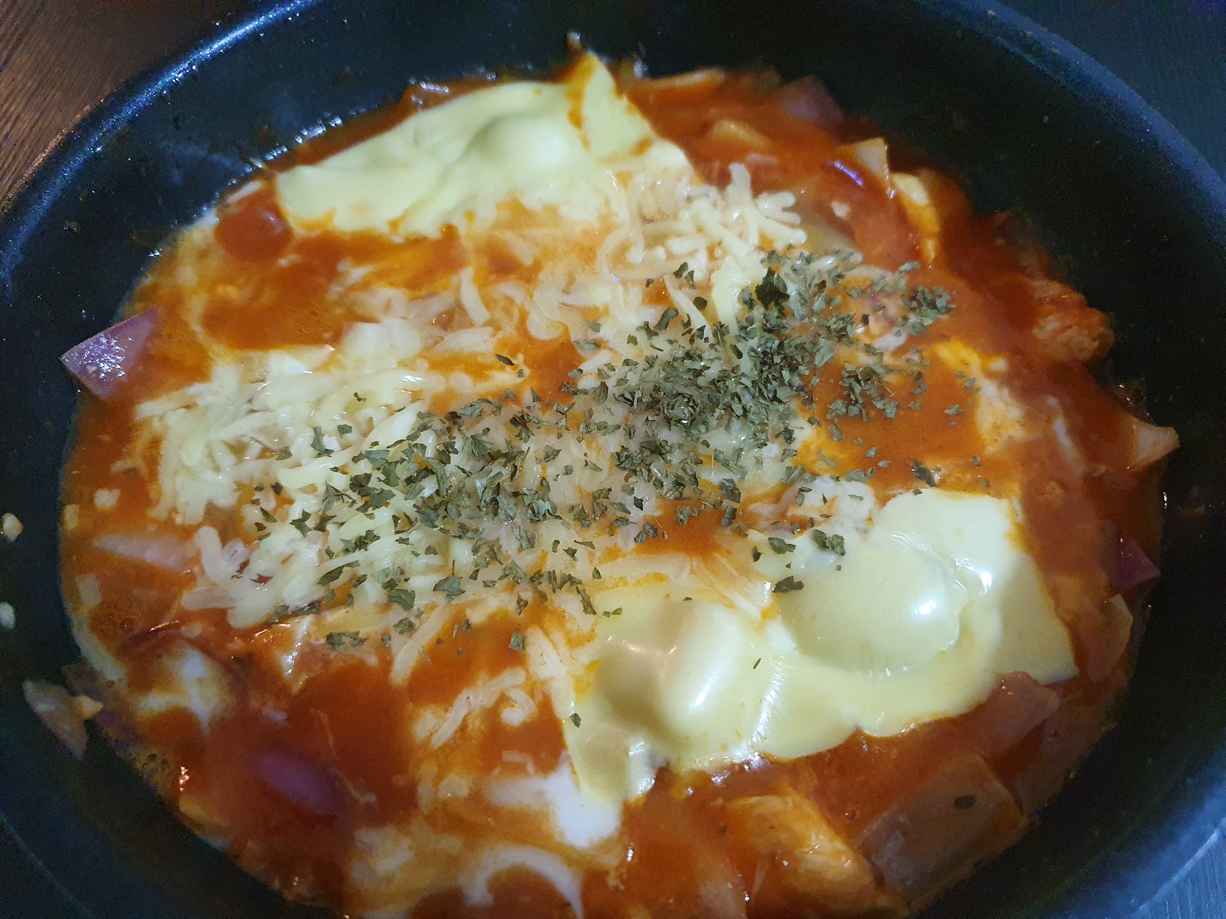 재료 : 토마토소스(퓨레), 닭가슴살, 계란, 양파, 체다 치즈, 모짜렐라 치즈, (파슬리)