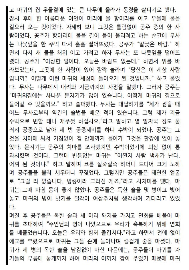 흔한 설화이지만 우리나라에 있는 설화와는 좀 다르지 않나요? 유럽이나 페르시아 시대의 설화(아라비안 나이트) 느낌이 들어서 재밌게 읽었다.
