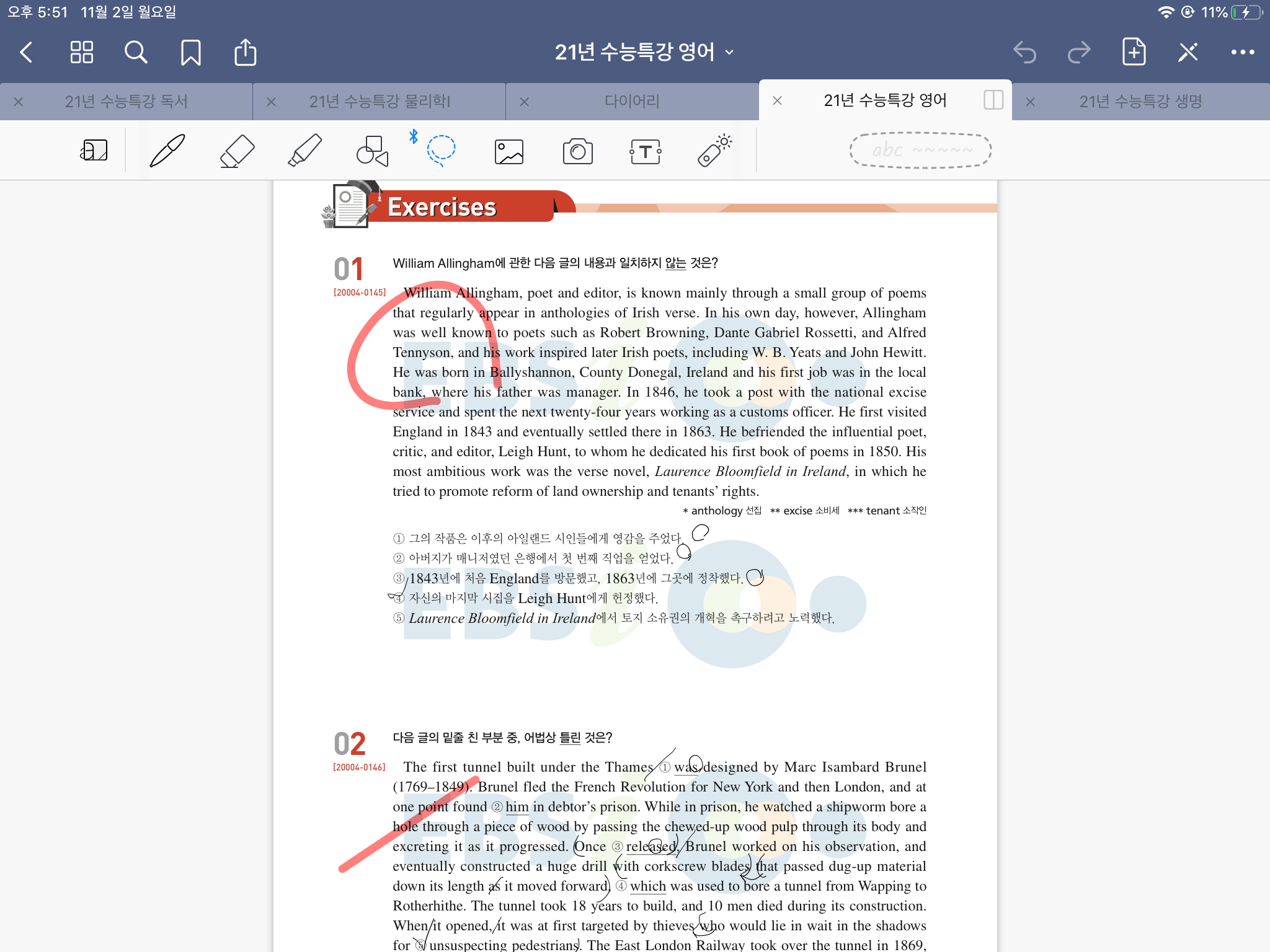 나는 공부를 하기 위해 굿노트를 다운 받았다. PDF 파일들을 아이패드에 다운받고 굿노트 앱을 통해 열고 저장하면 필기도 가능하다. EBSi에서 무료로 다운 받은 수능 연계 문제집, 기출 모의고사 시험지와 인터넷에 돌아다니는 문제집 PDF 파일들을 굿노트 앱으로 열어 사용했다. 개꿀!!