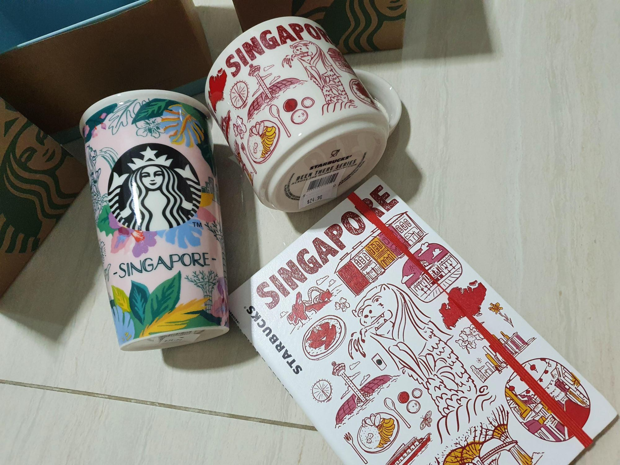 왼쪽 도자기 텀블러는 SGD 29.66 (23,000원), 머그컵은 SGD 21.16 (18,000원), 노트는 SGD 10.97 (9,300원)에 구매했다.