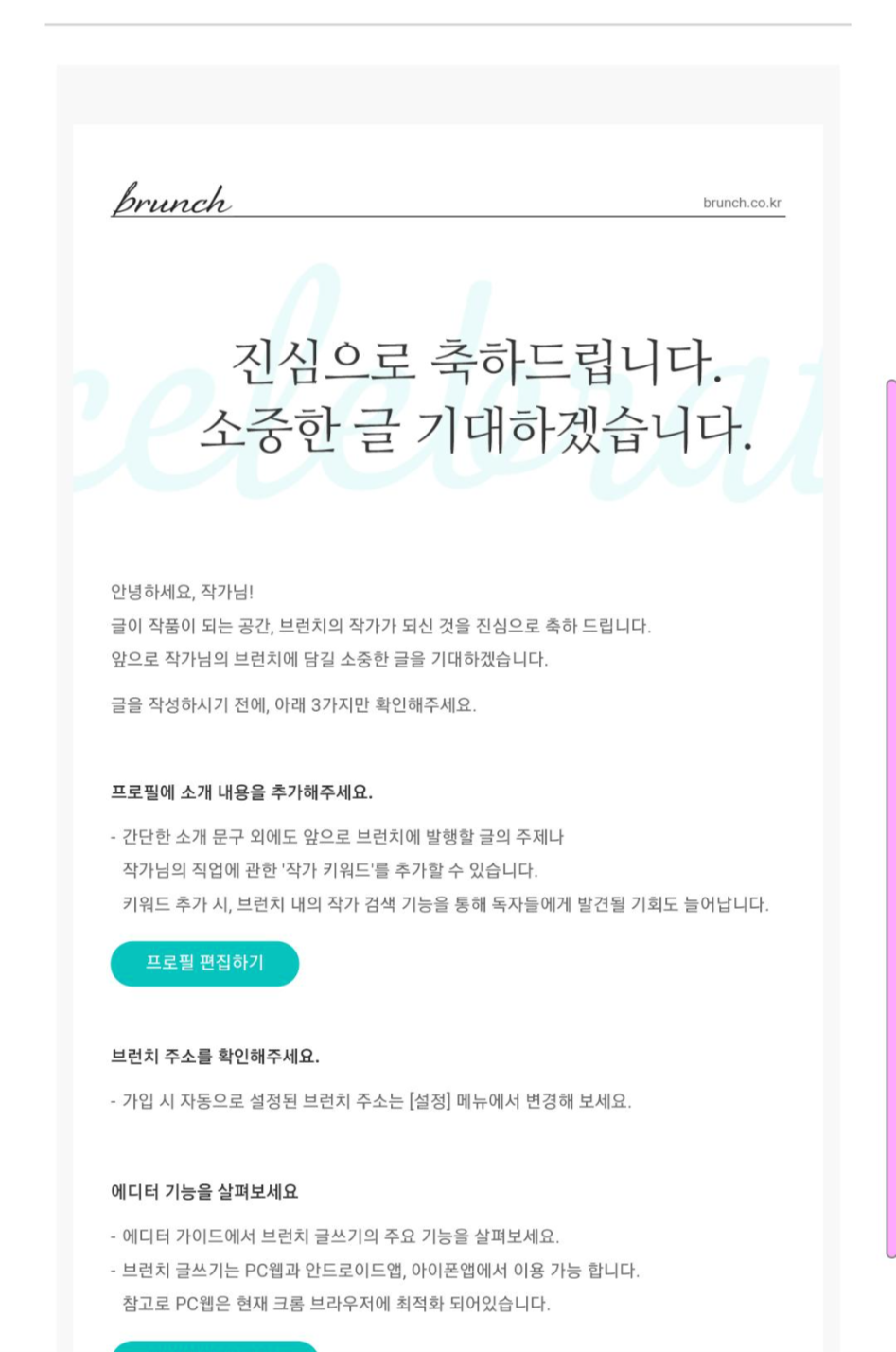 그리고 고대했던 카카오 브런치! 브런치는 작가 승인을 받아야만 글을 발행할 수 있는데 운 좋게 한방에 승인을 받았다. 브런치 작가를 신청하기 위해서는 자기소개와 향후 글감에 대한 주제 및 목차 소개, 그리고 그에 맞는 브런치에 저장한 글, 기타 개인 블로그나 사이트 정보가 필요하다. 티스토리 블로그 덕일 수도 있고 직장인 수능 도전이라는 주제 때문에 승인을 받은 것 같다. 낙방 안 돼서 정말 다행이다... 제출해야 할 게 많아서 두 번 신청할 자신은 없었다. 브런치엔 정보성 글이 아니라 공부 일기를 적을 예정이라 공유는 안 할 거 같다.
