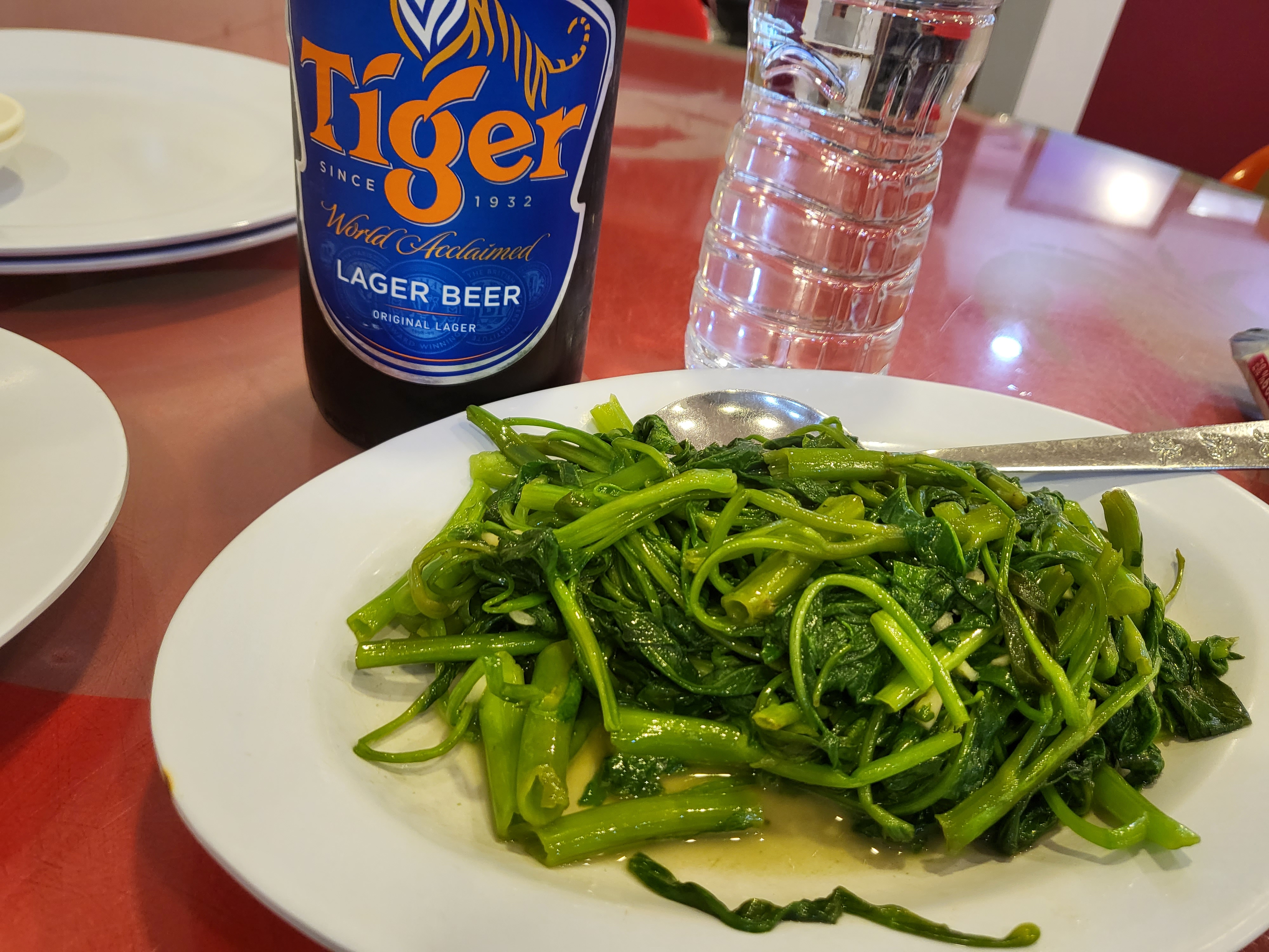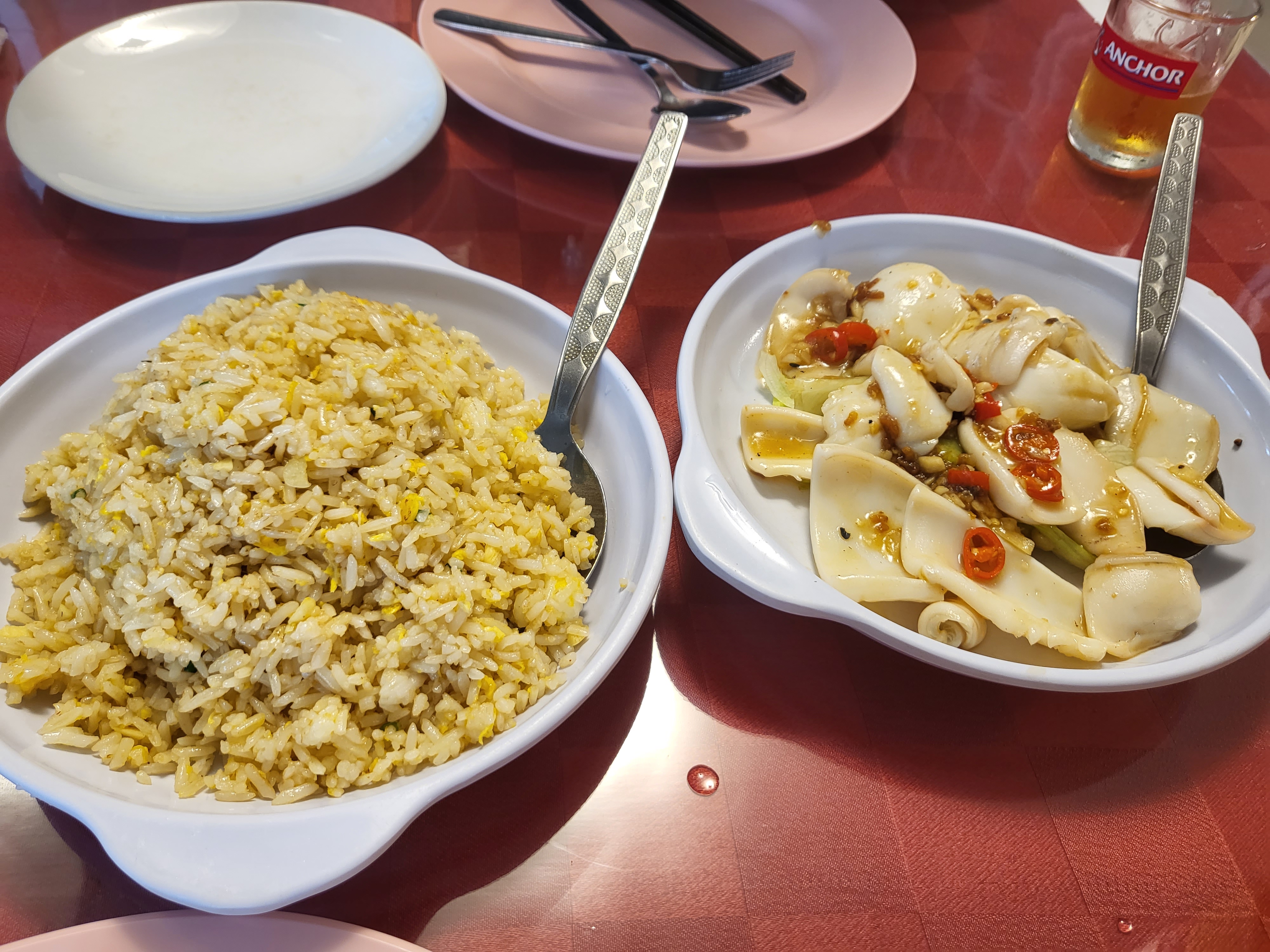 칠리크랩은 다음에 먹기로 해서 버터 새우 Butter Prawn이랑 튀긴 오징어 Deep Fried Squid, 모닝글로리 볶음 Kangkung, 볶음밥 Fried Rice을 먹었다. 새우 shell remove를 요청했어야 했는데... 까먹음 ㅎ