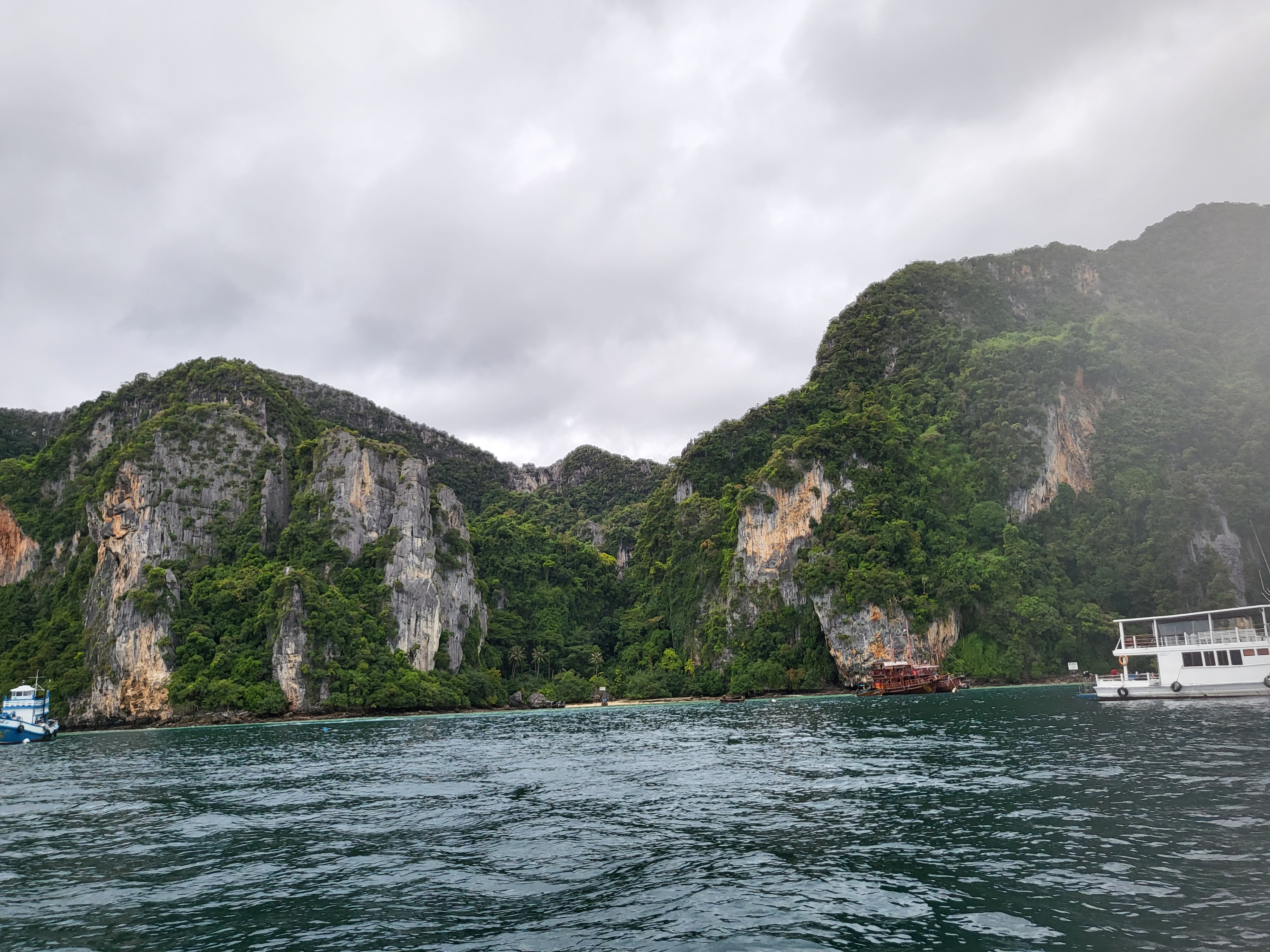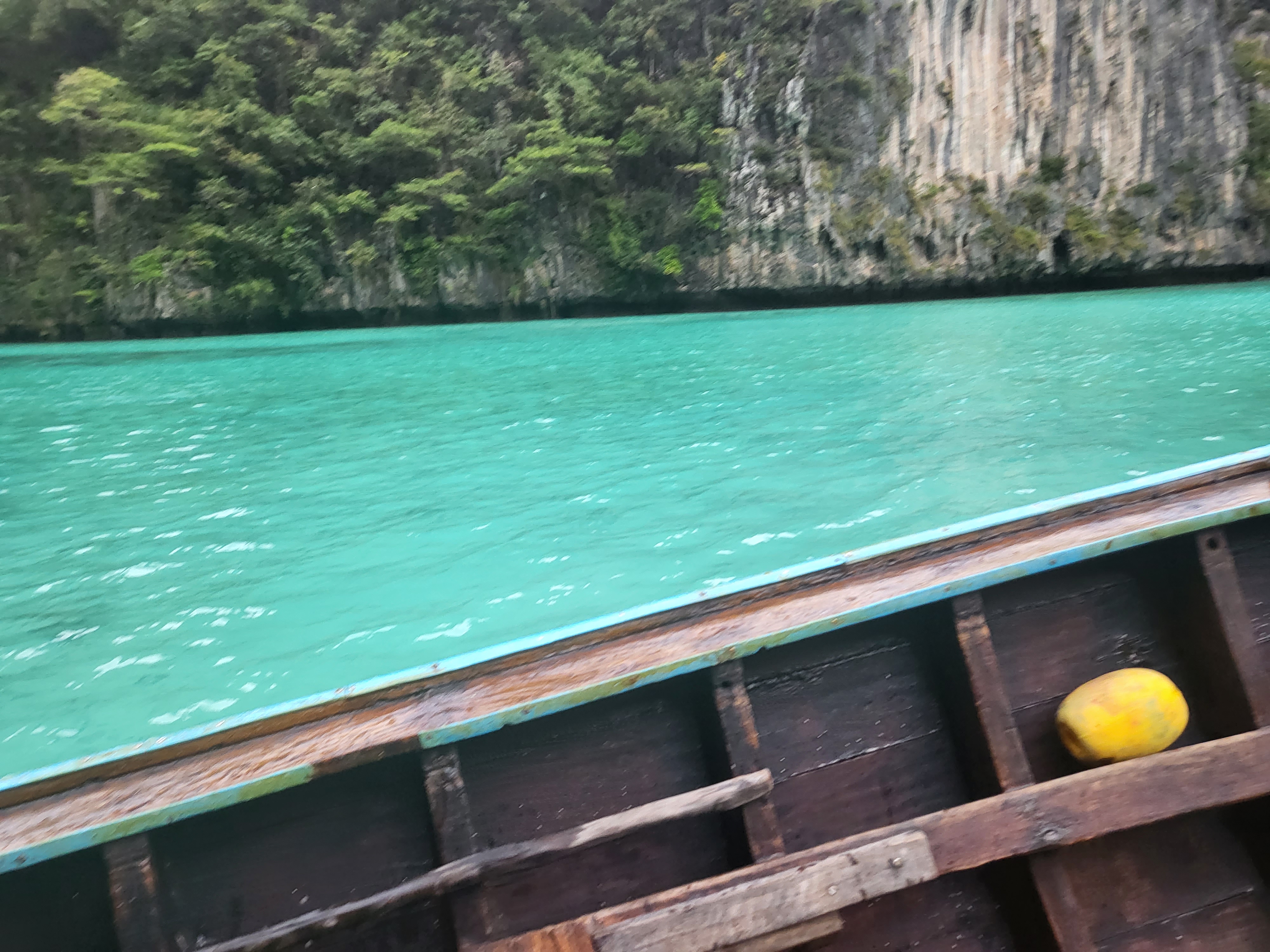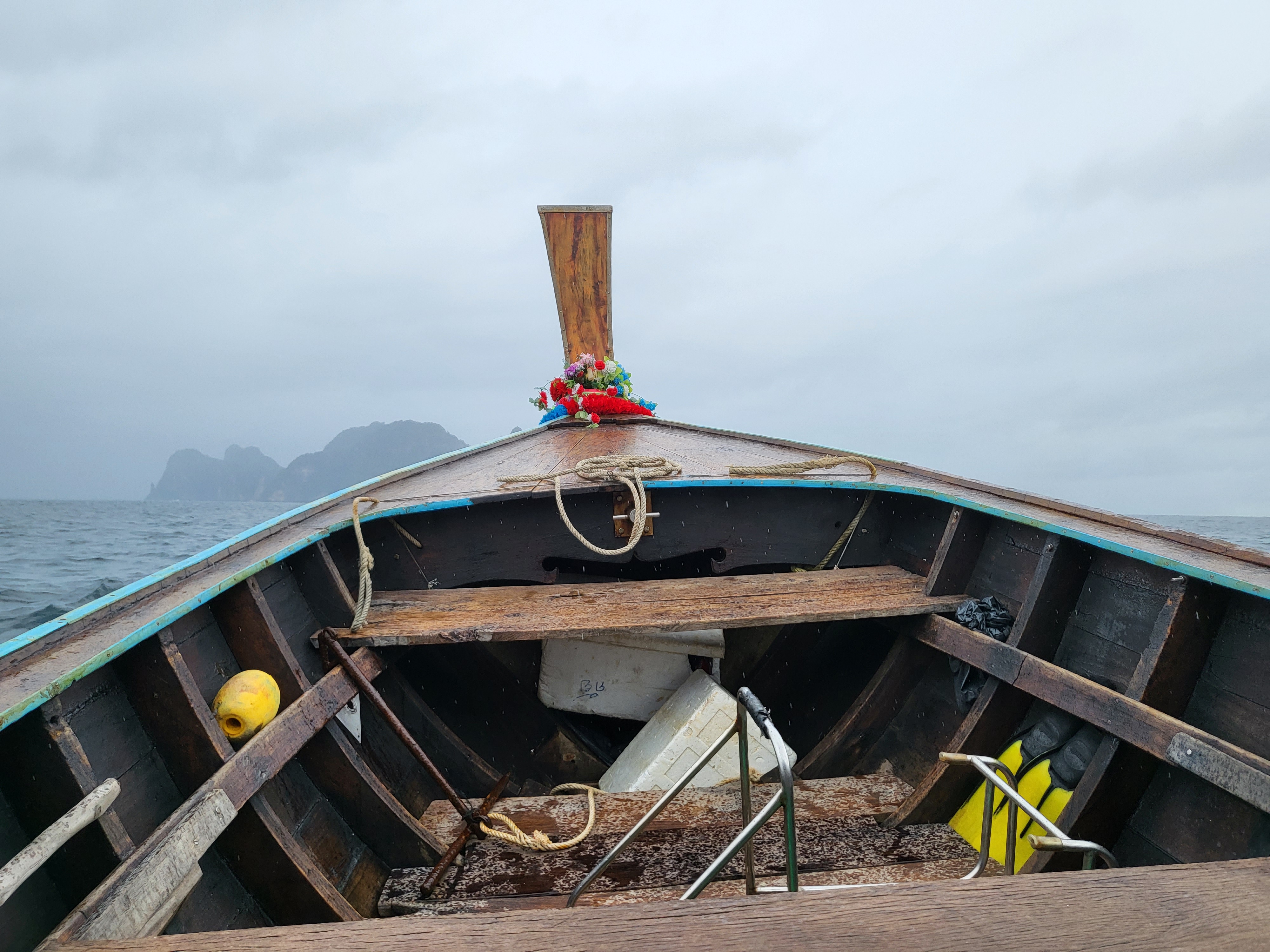 그리고 이제 본격적으로 바다를 구경하러 가는데.. 갑자기 비바람이 치기 시작했다.. 이미 날씨예보로 여행 전부터 예상하곤 있었지만 배 앞쪽에 앉아있다가 비싸대기를 맞으니 서글펐다. 다음에 비 안 올때 피피섬 또 가야지 ㅠㅠ