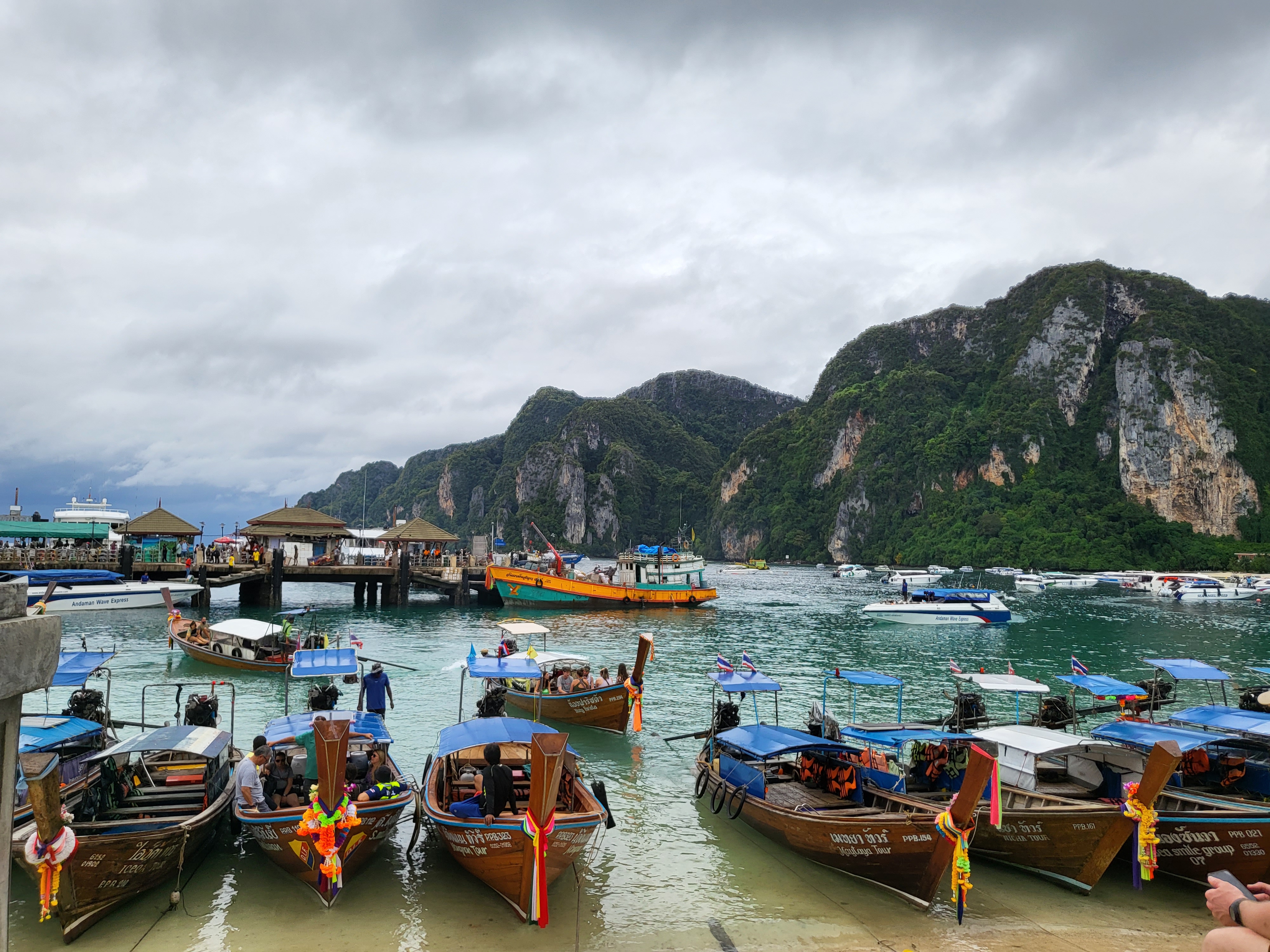 피피섬 항구에 이렇게 롱테일 보트들이 쭉 늘어져 있었는데 이게 모두 섬투어용이었던 거다. 투어 중간중간 보트에서 내렸다 탔다 해야 해서 헷갈리지 않게 보트마다 꽃도 달고 그림도 그려서 조금씩 다르게 꾸며놨다. 귀여움 ㅎㅎ