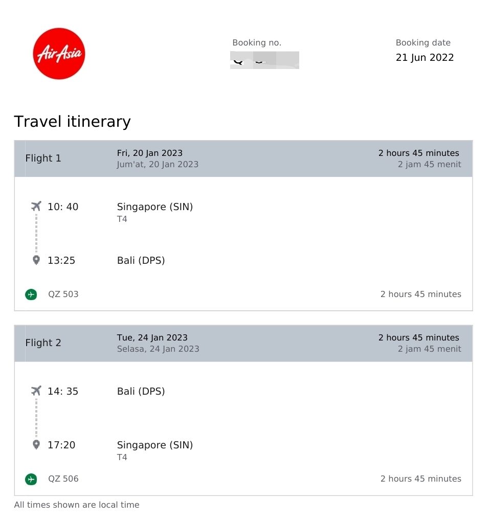 싱가포르에선 2시간 45분이 걸리고 명당 231.7 SGD (약 217,000원)에 구매했다. 굉장히 운이 좋았던 게 싱->발리 항공권을 16:00-18:45 시간대를 샀는데 에어아시아에서 항공편이 변경돼서 10:40-13:25으로 변경이 됐다! 반대였으면 쌍욕이 나왔을 텐데 이건 행복함 ^^