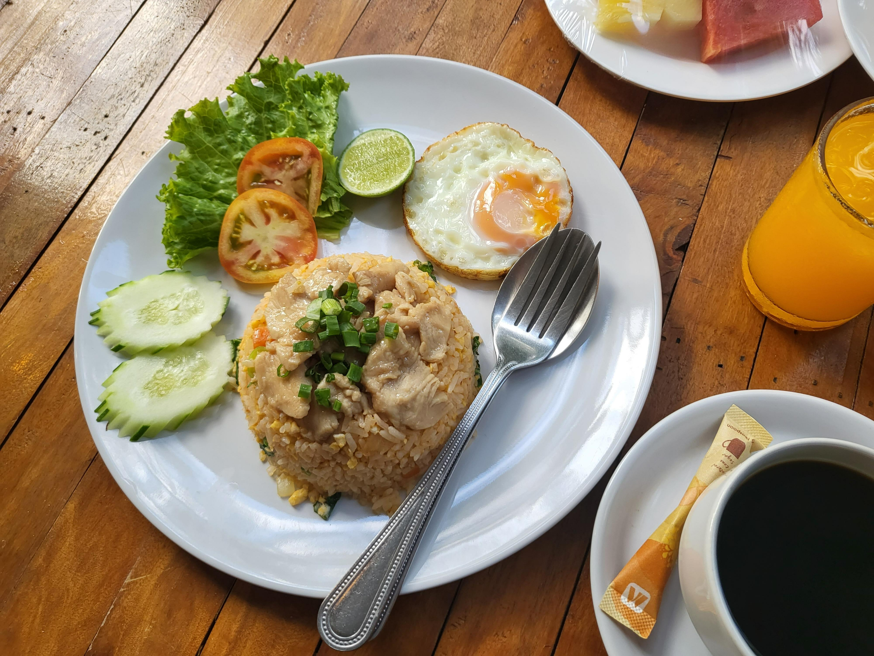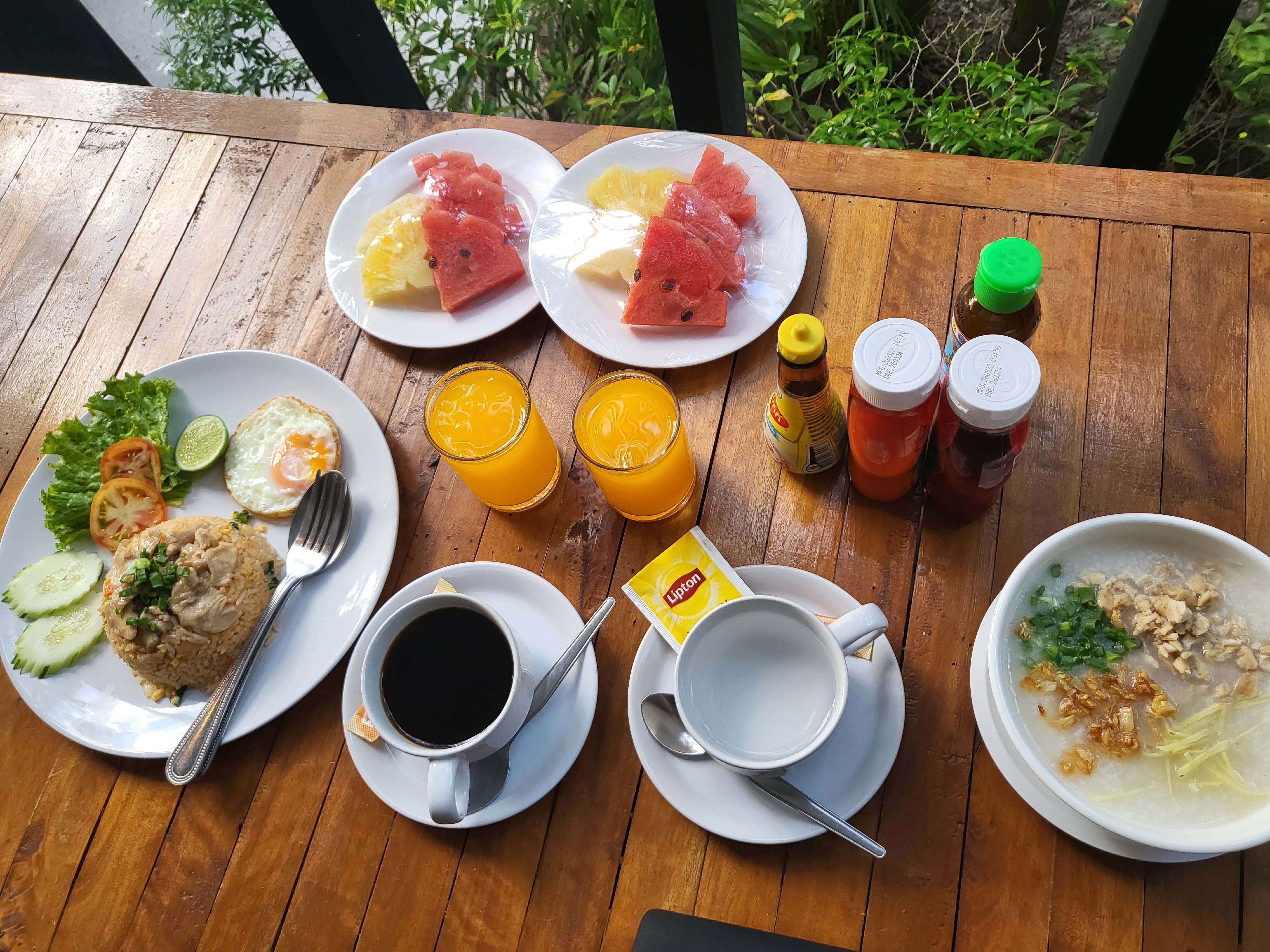 조식 메뉴도 꽤 다양해서 선택을 해야 하는데 매일 전날 직원분이 물어봐 주신다. 우린 Thai 식 밥과 면, American식을 먹어봤다. Thai식 밥이 가장 맛있었음..! 커피나 차도 주고 과일주스에 과일까지 주셔서 정말 알찼다.