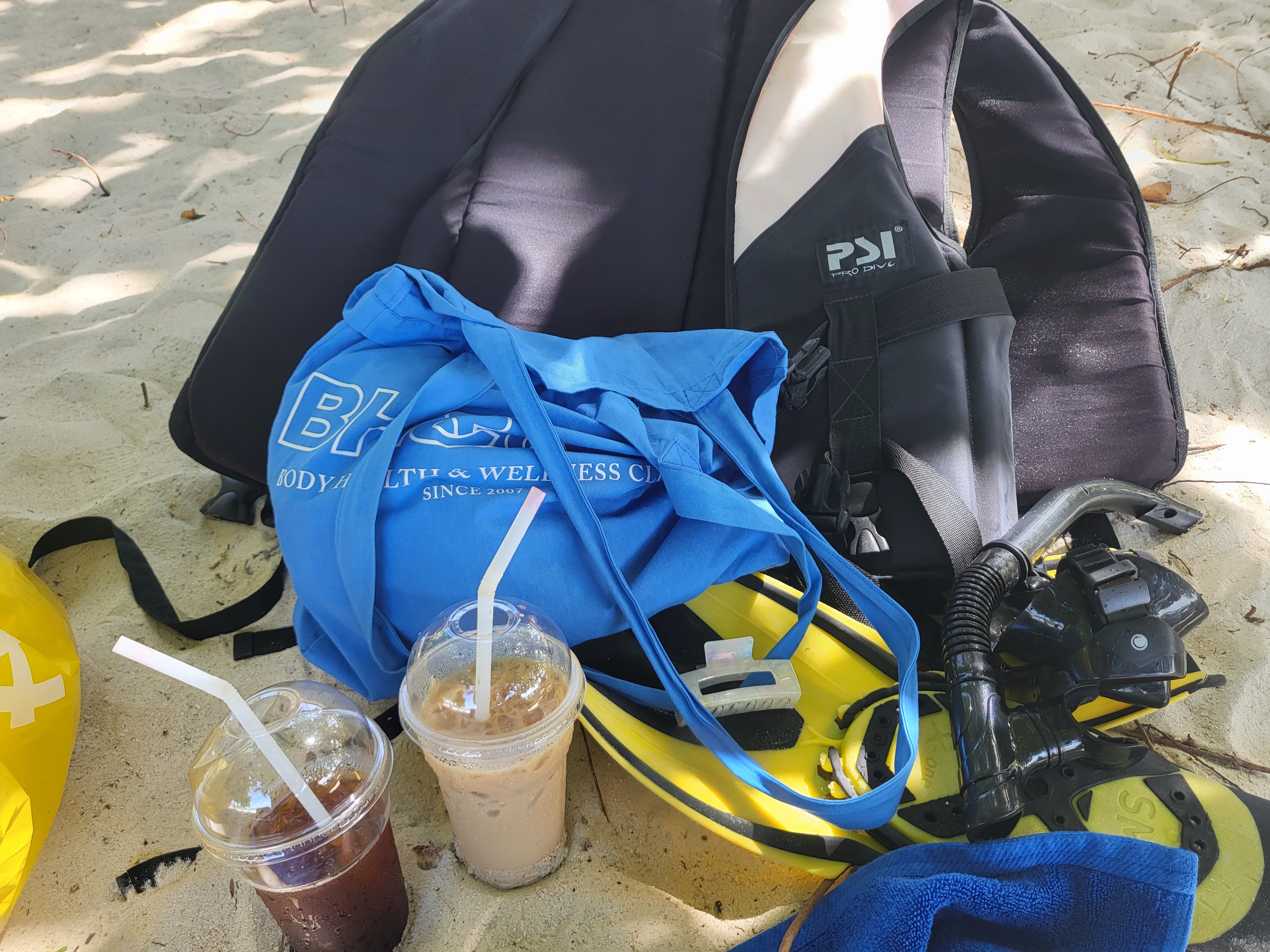 힘들게 들고 온 리조트 비치 타올과 장비들을 놓고 커피 한잔 마시면서 쉬었는데 주변에서 줄담배를 피워서 힘들었다. 노담 합시다!