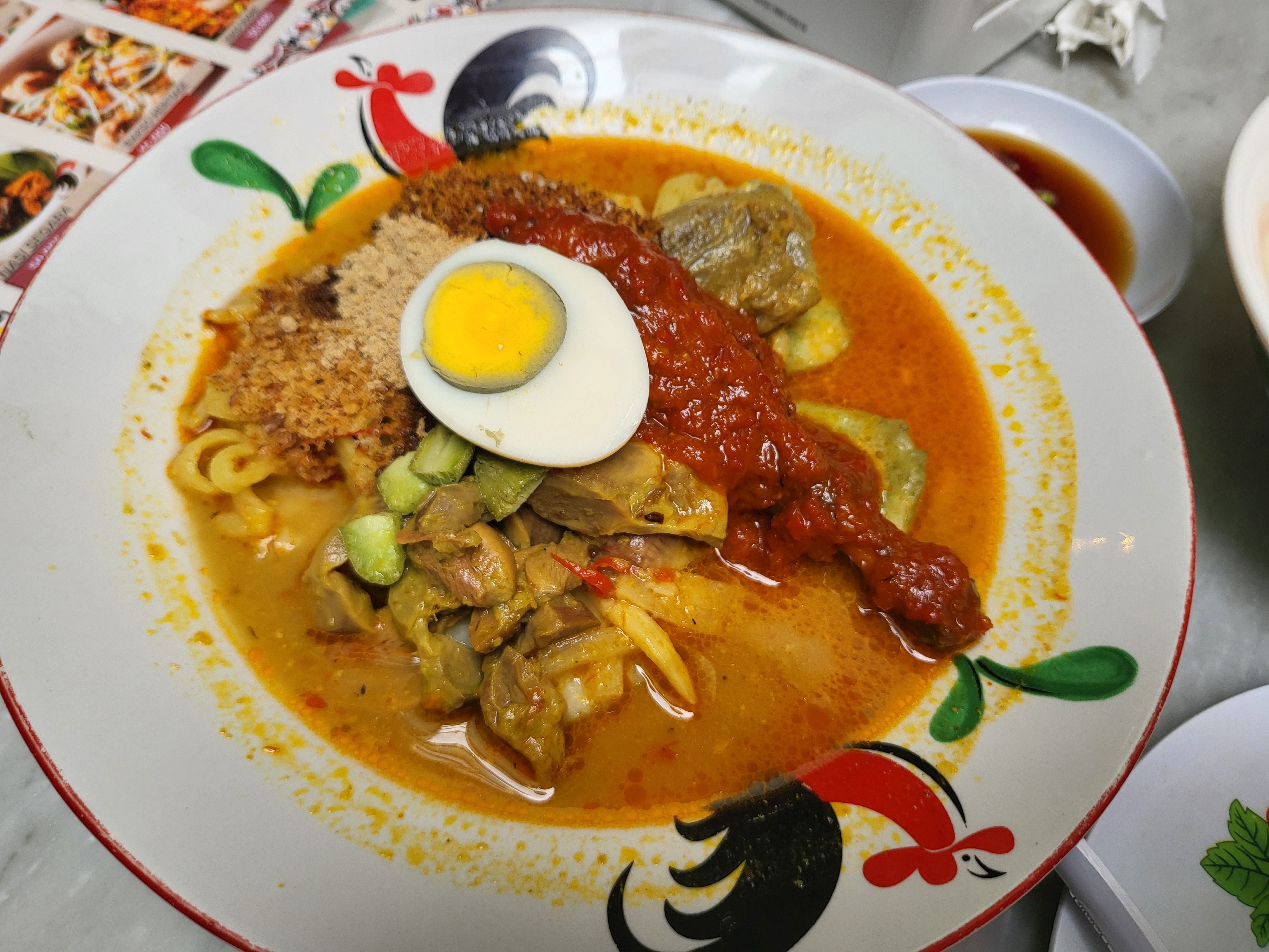 국물을 소면에 부어 먹는 음식이라고 한다. 국물은 ayam 닭고기가 들어가 있었는데 흔한 삼계탕 맛이었다. 소면에 김까지 있어서 한식 먹는 느낌. 익숙한 맛이었다.