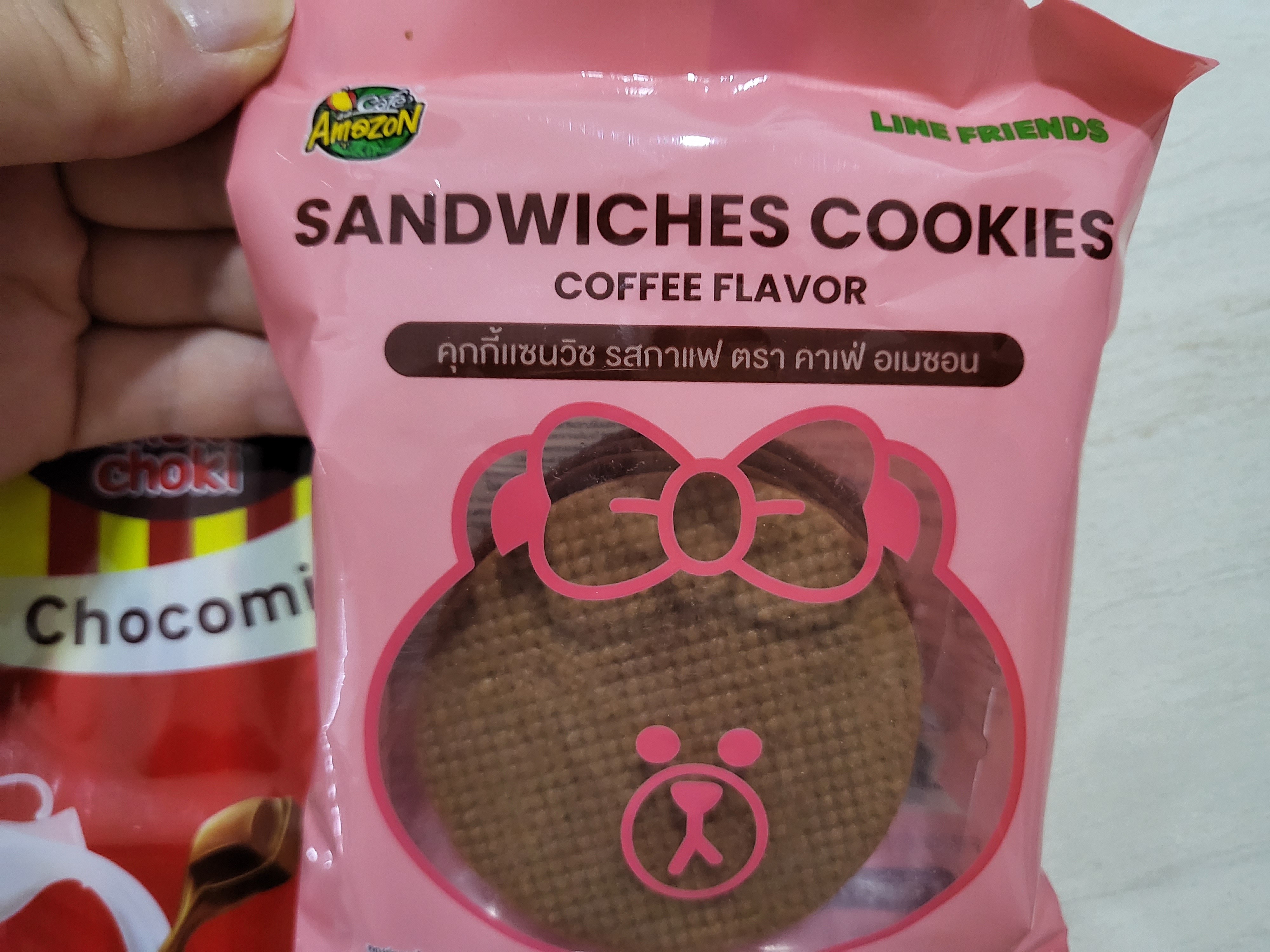 라인프렌즈와 콜라보 제품을 많이 파는데 샌드위치 쿠키를 팔길래 초코가 그려진 커피맛을 사 왔다. 근데 맛은 별로 ㅠㅠ 느끼했다.