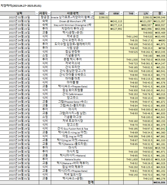 태국 치앙마이 4박 5일 여행으로 총 836,806원을 지출했다. 1박 몬쨈에서 묵은 때 교통비와 숙소비, 숙소에서 저녁식사비가 좀 비쌌던 거 같다. 그거 말곤 다 자잘한 비용이라 크게 지출한 건 없었다. 치앙마이는 전체적으로 물가가 굉장히 쌌다. 공예품들 가격은 비쌌지만 먹고 다니는 거는 정말 저렴했음!