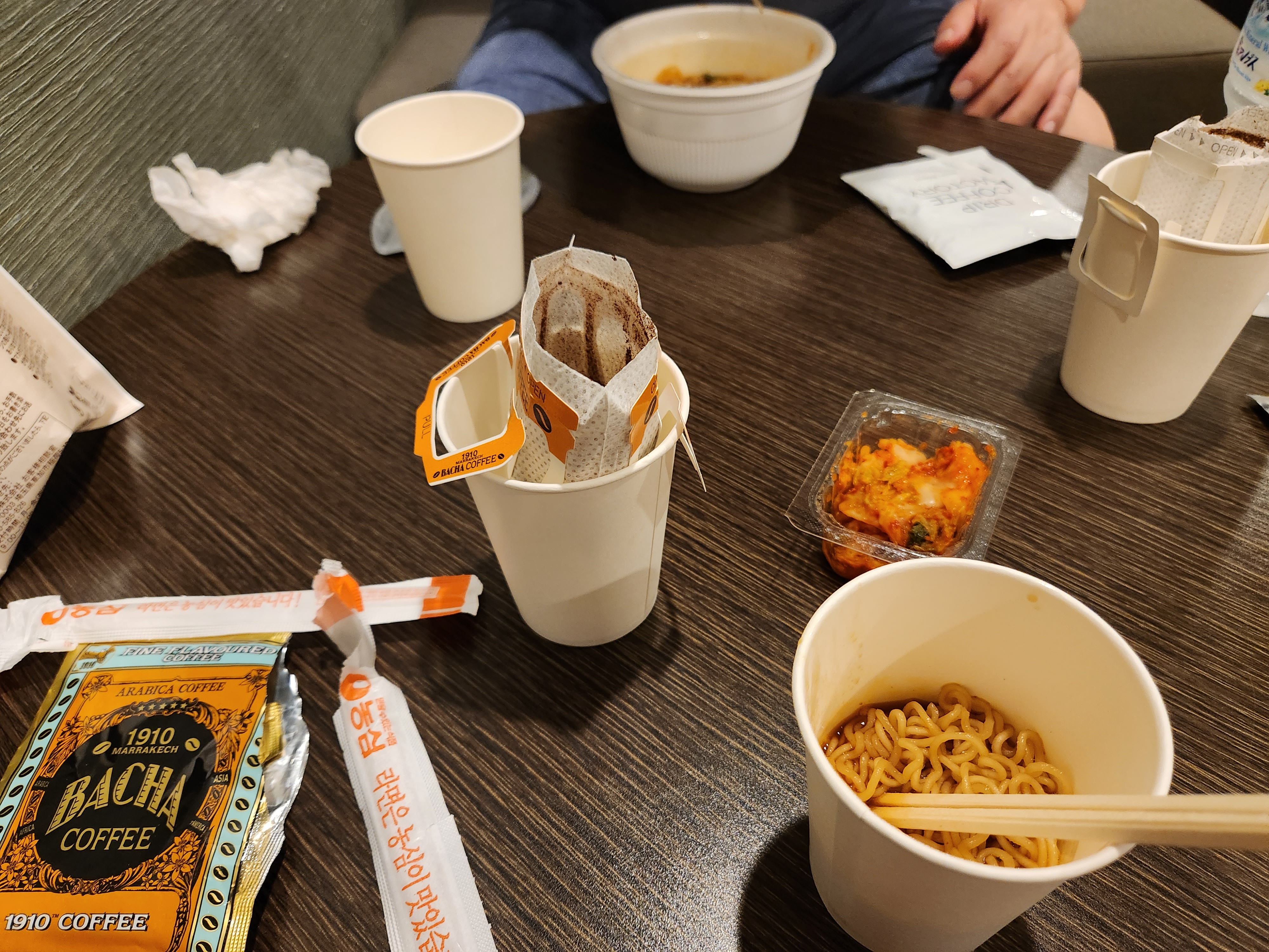집에 챙겨 온 육개장 라면과 로쏜 편의점에서 산 김치(뭐냐 진짜 맛있음) 그리고 디저트는 면세점에서 산 바샤 커피