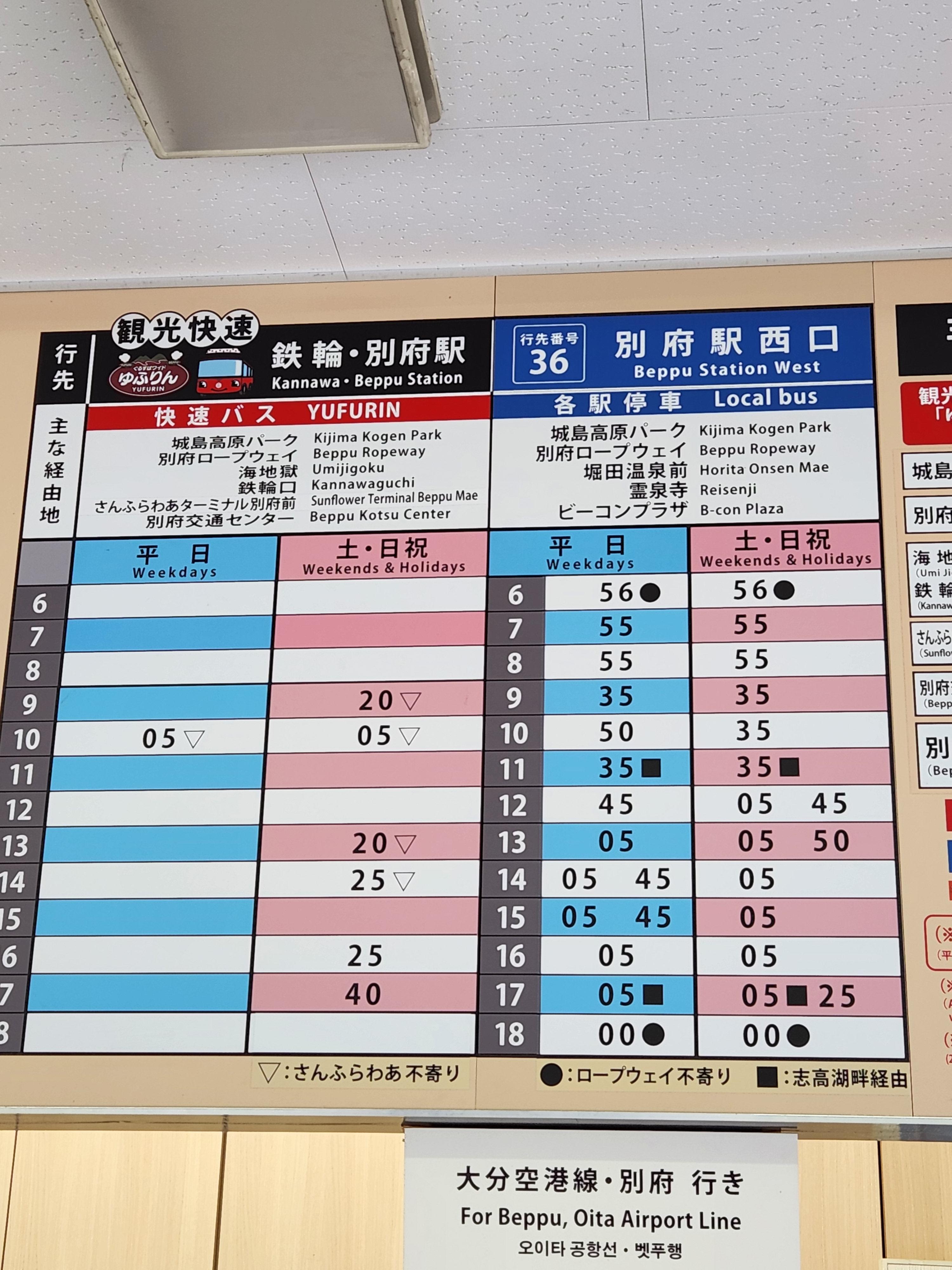 나는 벳푸역까지 가는 버스를 탔는데 대부분 주말에만 이용하는 유후린 Yufurin 버스나 36번 시내버스를 타면 된다.