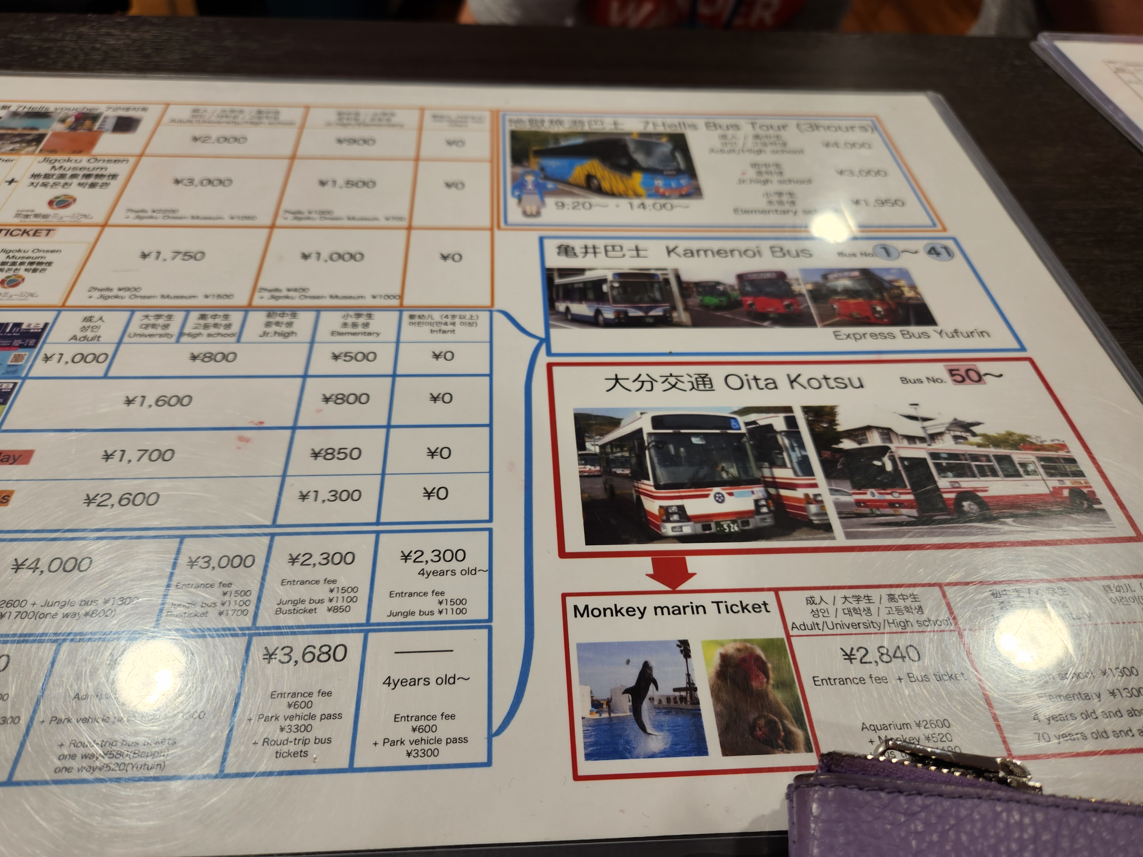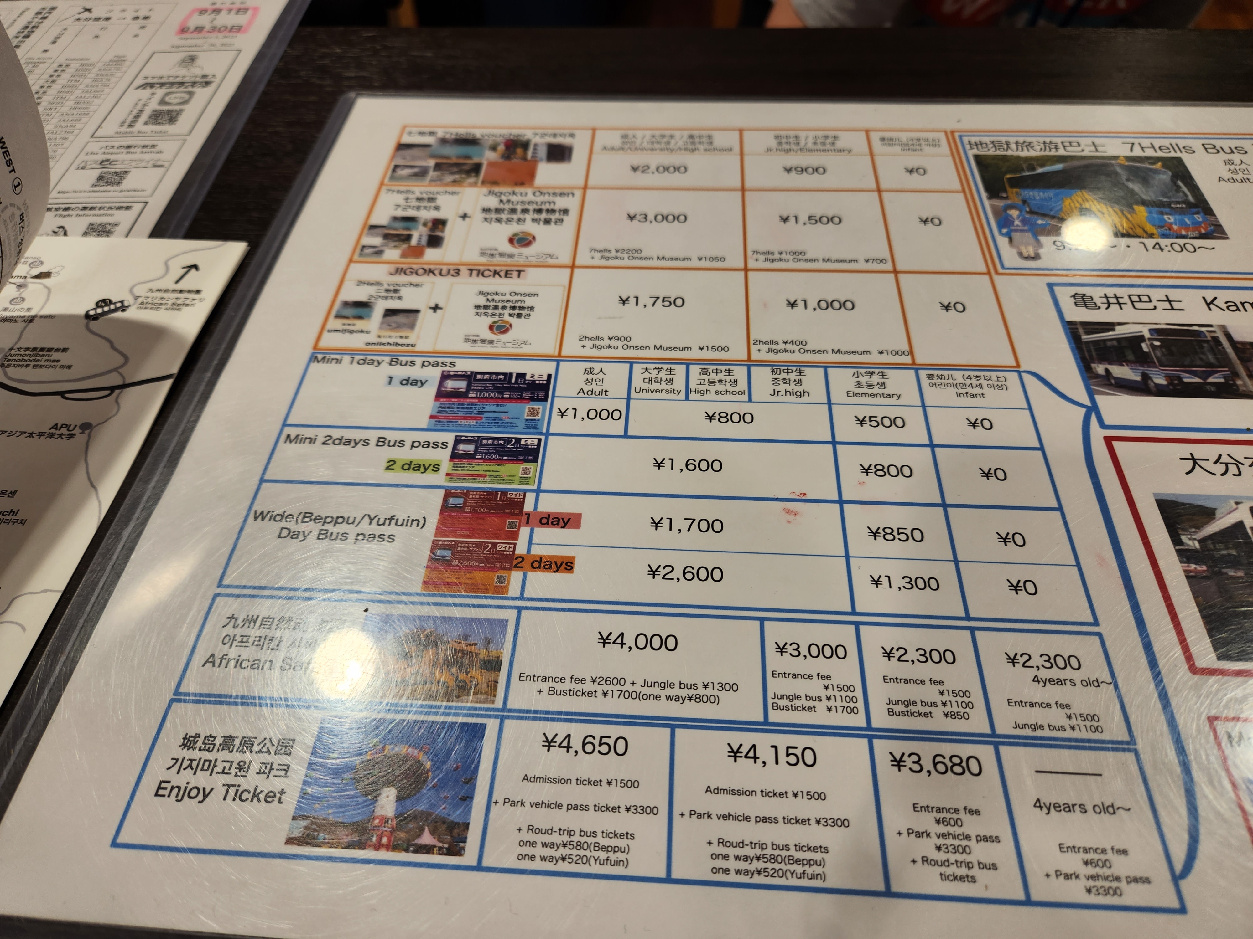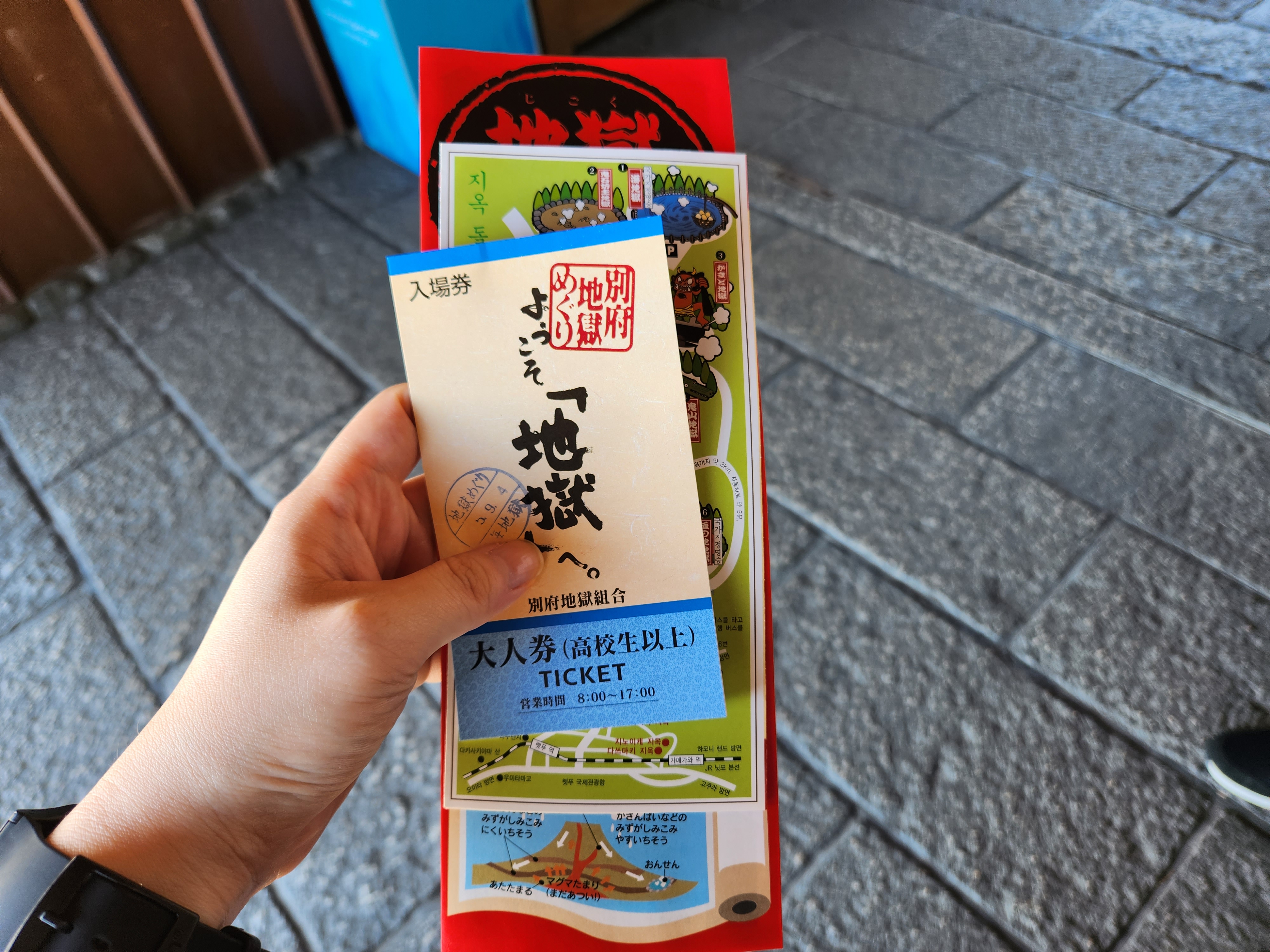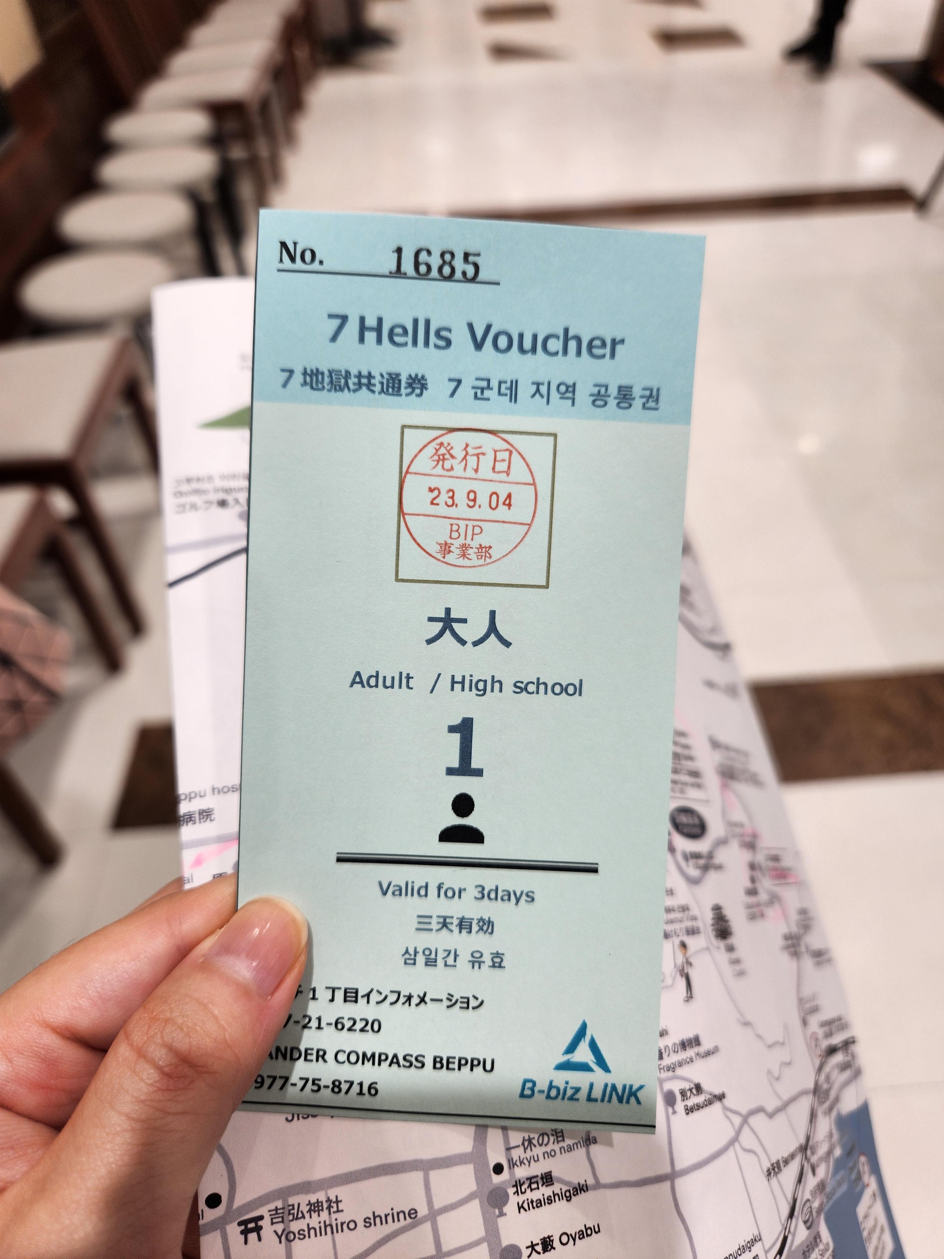 각각 온천 입구에서 입장권을 구매해도 되는데 7개를 합쳐서 파는 지옥 온천 입장권을 구매하면 조금 저렴하다. 각 온천 입구에도 팔고 벳푸역 인포메이션도 판매한다. 나는 7 군데를 모두 갈 예정이라 벳푸역 관광안내소에서 입장권과 1일 버스 티켓을 함께 구매했다.