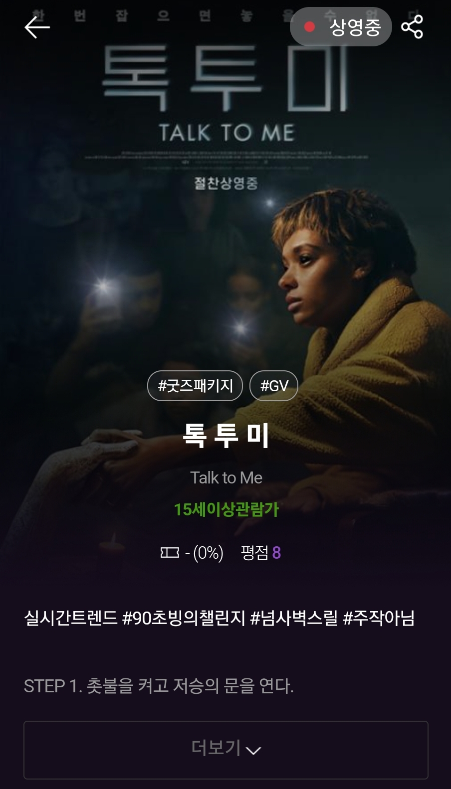 톡 투 미는 개봉 전부터 정말 기대했던 공포영화인데 징그럽고 무섭지 않아서 눈도 안 가리고 봤다. 내용은 흥미로웠는데 많이 안 무서워서 조금 아쉽..